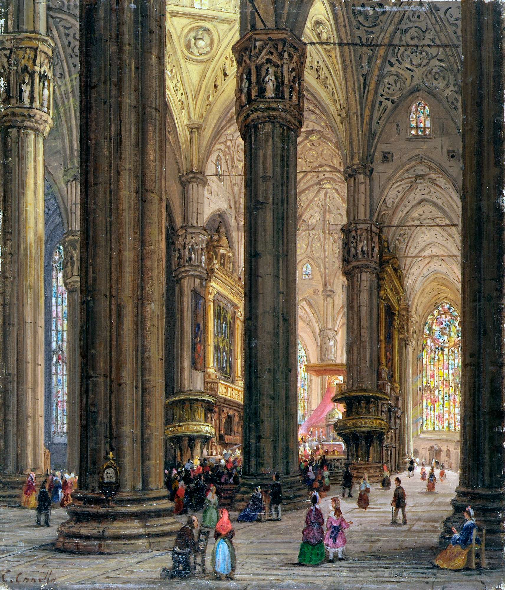 Meno noto del fratello Giuseppe, forse il paesaggista di maggior successo operante a Verona nella prima metà dell'Ottocento, Carlo Cannella predilesse, quali soggetti, le vedute di Verona, Venezia, Milano, Firenze e gli interni delle chiese delle medesime città , arricchendo le scene con la presenza costante di macchiette popolari di ascendenza fiamminga. Per quanto riguarda il dipinto "Interno del Duomo di Milano" probabile che si tratti della ripresa di un'opera analoga del fratello "Interno di una chiesa Gotica" (Milano, propr. Ongaro) datata 1837 (R. Bassi - Rathgeb, Il pittore G. Canella 1788 - 1847, Bergamo 1945, tav. XVI). Dal Catalogo della V Esposizione della Società Triestina di Belle Arti del 1844 risulta che un dipinto di Carlo Canella, titolato sempre "L'interno del Duomo di Milano", venne acquistato dalla stessa Società per 15 fiorini. Si sottolinea inoltre come esista una tela dal medesimo titolo (Vienna propr. Wollisch), firmata Canella minore (sic) e pubblicata su di una monografia dedicata al fratello Giuseppe (R. Bassi - Rathgeb,1945, tav. XXVII) che una versione, solo parzialmente difforme, rispetto al nostro quadro. Relativamente alla circolazione di queste opere nell'ambito triestino, possiamo ricordare che Carlo Canella partecipò anche alla III Esposizione della Società Triestina di belle Arti del 1843 con tre dipinti: "Parte di una casa rustica con figure e bestiame", "L'interno di una cucina" e "Cena nell'interno di una stanza". In essi sicuramente evidente una notevole analogia con la produzione del fratello, cosa che, d'altra parte, si riconferma anche nei due quadri conservati al Civico Museo Revoltella. A tal proposito si può notare come i personaggi popolari trovino i loro più puntuali modelli di riferimento in alcuni disegni di Giuseppe Canella ora conservati a Milano (Museo del Castello) fra i quali ricordiamo: "Chiesa di S. Eustachio a Parigi" e "Mercato a Parigi". Sulla presenza dei due fratelli alle esposizioni triestine, la Levi precisa: "Anche da Milano vennero paesaggisti e vedutisti, come Giuseppe Bisi [...], Luigi Riccardi ed i due Canella, Carlo e Giuseppe, quest'ultimo habituè alle esposizioni dei Kunstvereine tedeschi" (Levi, 1985, p. 19).