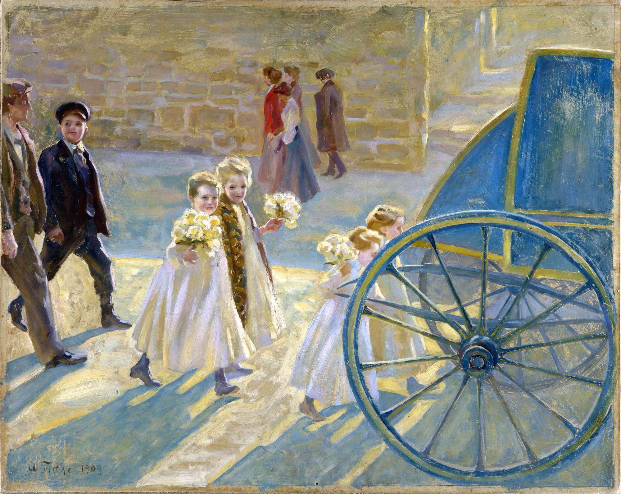 Dalla pittura nordica (tedesca e bretone, per lo più), che Arturo Fittke ha occasione di ammirare soprattutto nel contesto delle biennali veneziane, l'artista deriva la tematica delle «processioni» elaborata negli ultimi anni della sua vita, tra il 1908 e il 1909. Artista triestino originario di Bredow (Stettino), morto suicida l'anno successivo all'esecuzione del dipinto in esame, Fittke era particolarmente apprezzato dal pittore triestino Umberto Veruda, che di lui realizzò un significativo ritratto. Amico di famiglia di Italo Svevo e Livia Veneziani, dedicò a quest'ultima e alla figlia, Letizia, alcuni ritratti di grande intensità psicologica. Realizzato nel 1909, il "Funerale di bambino" donato al Museo Revoltella dall'architetto e mecenate Alessandro Hummel, assieme al dipinto di soggetto analogo "La processione" (1908), è preceduto da una versione analoga, appartenente a collezione privata, “meno azzurra nel colore e meno definita nella forma”, che fu presentata alla «Permanente» del 1908. «Dipingeva quasi sempre su cartone e non per ragioni di economia – ricorda Emerico Schiffrer nel 1925. – […] Quando per lavori di proporzioni maggiori credette di rinunciare, fu imbarazzato, finché decise di tender il cartone sul telaio al modo della tela, affinché non si ondulasse; e fu felicissimo dell'esperimento.» Tale sistema di prevenzione della deformazione del supporto pittorico è da lui applicato anche nel quadro esaminato. «Preferiva il cartone – conclude l'amico - per la sua superficie liscia, per il suo simpatico color grigio ed anche per la praticità di poterselo preparare da solo, secondo il bisogno. Egli lo ricopriva leggermente di colla e gesso sì da non togliergli l'assorbenza. Evitava così la lucidità grassa dei colori e li rendeva vaporosi.» (E. Schiffrer, Arturo Fittke, edizioni dello Zibaldone, Trieste 1951 [con le lettere di Fittke e Rovan] p. 24) Il soggetto, pur dedotto dagli esempi del realismo europeo “tinto di simbolismo”, risente della singolare personalità di Fittke. “Guardato attraverso il prisma del suo stato psichico -rileva Renata Da Nova nel 1979- il funerale è reso con una tecnica e un colore originali. […] La malinconia del tema è riscattata dalla «soavità di colori e di luci», dagli azzurri, rosa, gialli dorati dalla sua fluida morbidezza e dalla inquadratura moderna della scena, tagliata con occhio fotografico. Si sente appena il suggerimento che l'opera del Tito, da Venezia, dovette dargli nelle tonalità ariose roseo-bionde e nel taglio fotografico e compositivo. ” A un anno di distanza, la copia del Museo Revoltella appare maggiormente definita “nella resa dei volti e nei giochi di luci ed ombre, specie nel carro e nel profilo luminoso delle due figure a sinistra […]”. Una serie di fattori inequivocabili, quali il tipo di inquadratura e l'identità di alcuni dettagli nelle due versioni successive, fanno ipotizzare che il prototipo della scena raffigurata sia stata una fotografia anziché un bozzetto, secondo un procedimento abitualmente adottato da molti artisti del secondo Ottocento (Da Nova). Il Museo Revoltella possiede di quest'artista altri sette olii (ritratti e paesaggi), e sei disegni, tra i quali tre Autoritratti eseguiti tra la fine dell'800 e l'anno della sua morte.