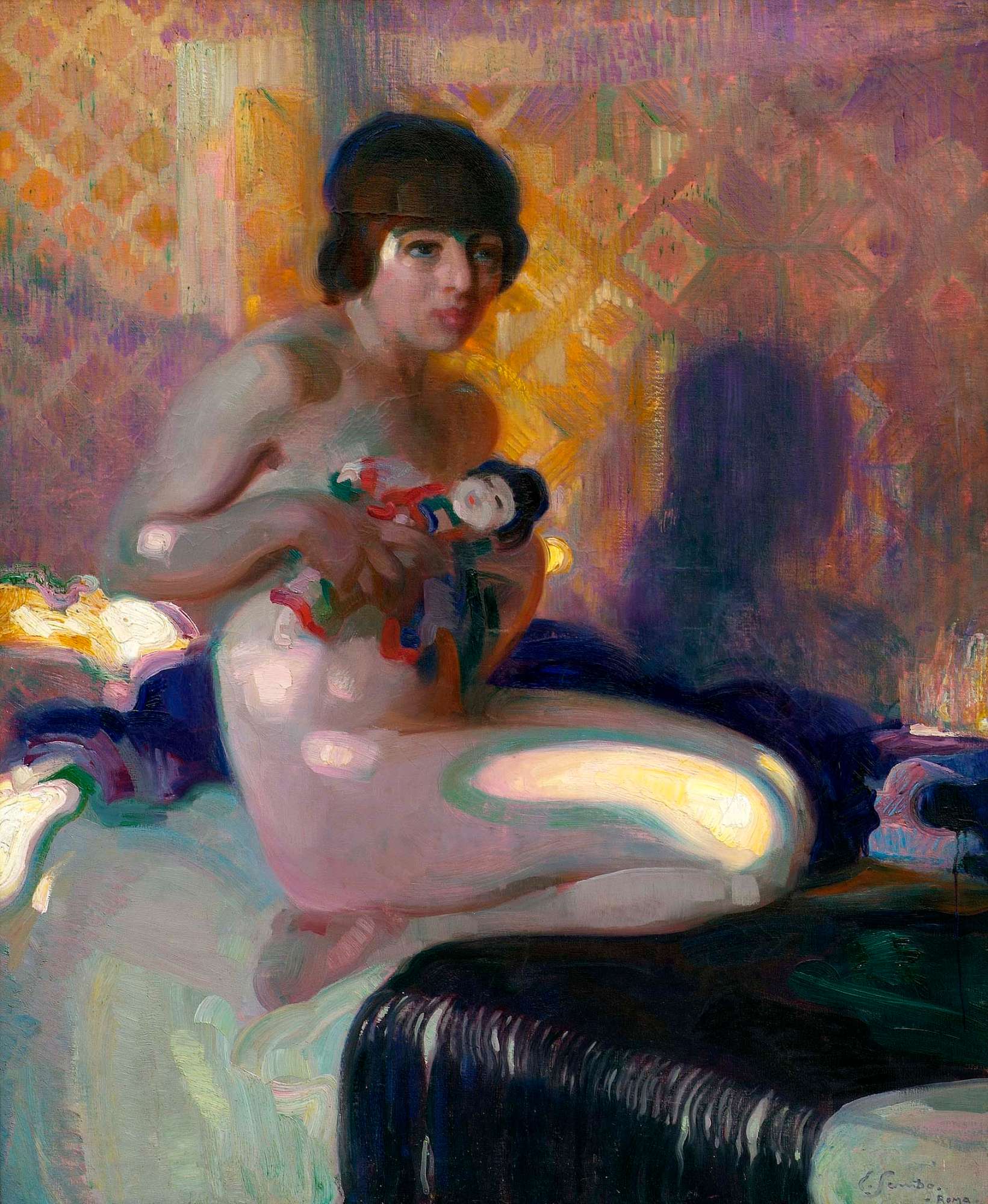 Nel 1922, poco dopo la ripresa dell'attività interrotta dalla prima guerra mondiale, il Museo Revoltella decide una serie di acquisti finalizzati ad aggiornare la collezione soprattutto per quanto riguarda l'arte contemporanea triestina. Tra questi c'è anche il grande dipinto "Macchie di sole" di Edgardo Sambo, da poco diventato membro del Curatorio e futuro direttore del museo (dal 1930 al 1959), ma anche pittore già affermato, che in quell'anno stesso partecipa alla Biennale di Venezia. "Macchie di sole" è un lavoro di dieci anni prima eseguito quando Sambo soggiornava a Roma (1911-1914) con la borsa di studio della Fondazione Rittmeyer. In precedenza, dal 1905 in poi, aveva studiato a Venezia, poi si era trasferito per un anno a Vienna e per tre anni a Monaco, seguendo un percorso abbastanza tipico degli artisti triestini di quegli anni e assimilando il gusto per le raffinatezze cromatiche e le eleganze lineari della Sezession. L'opera in esame, che all'origine si intitolava "Bambola", dalla bambolina giapponese che la giovane modella accovacciata sul letto si stringe al seno, nacque in un clima di questo genere e si fece facilmente notare alla prima mostra della Secessione romana (1913), nata per contrapporre una controllata modernità agli eccessi del futurismo, da un lato, e all'accademia dall'altro. Con la sua pennellata sintetica, i colori accesi e un modo nuovo di trattare luce ed ombra, Sambo si inserisce perfettamente in questo filone e la sua opera, col titolo "Macchie di sole" verrà scelta dalla Commissione Reale per l'esposizione organizzata a San Francisco per l'apertura del Canale di Panama, dove otterrà una medaglia d'argento. La guerra – a cui Sambo partecipò come volontario, meritandosi tre croci al merito – interruppe la sua ben avviata carriera e segnò anche un cambiamento nei suoi modi espressivi. Dal 1920 in poi, smorzati i lampi di luce degli anni romani, lo troviamo su posizioni vicine al Novecento italiano, che influiranno non poco anche nella gestione degli acquisti per il Museo Revoltella.