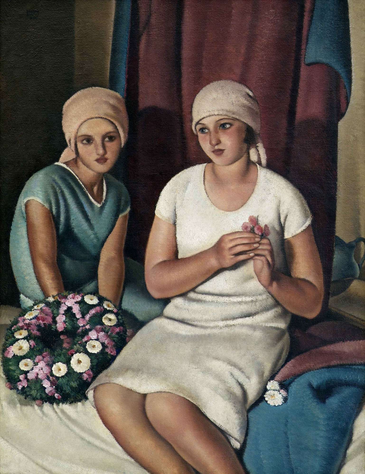 Il 20 giugno 1934 l'architetto Arduino Berlam scrive a Edgardo Sambo informandolo dell'intenzione del pittore Dyalma Stultus di cedere la Corona di San Giovanni in cambio dell'opera già posseduta dal museo, L'Antiquario, dietro pagamento di L.1.000 offerte dal Museo. In questo modo entra a far parte delle collezioni del Revoltella un'opera esposta nel 1931 alla V Esposizione d'Arte del Sindacato Regionale della Venezia Giulia dove è stata notata dall'architetto Berlam che la considera “una delle cose migliori apparse alle mostre recenti” (Berlam, 1934, p.81). Caratteristica della produzione degli anni trenta del pittore triestino, segna una tappa fondamentale del suo iter artistico; dopo gli esordi triestino-veneziani contrassegnati dalla necessità di sperimentare gli insegnamenti di matrice tedesca visti alle Biennali dei primi anni di attività Dyalma Stultus come molti altri suoi concittadini necessariamente si confronta con la realtà nazionale. Nel 1927 compie il suo primo viaggio a Firenze, dove si trasferirà definitivamente nel 1941, non rimanendo indifferente al Novecento, movimento al quale non aderisce ufficialmente ma che considera uno dei fenomeni artistici più interessanti anche sulla scorta dei rapporti avuti prima con Felice Carena e poi con Ardengo Soffici. L'esperienza fiorentina lo avvicina, però, non solo alle ultime tendenze artistiche ma gli offre anche la possibilità di conoscere personalmente la grande tradizione italiana, per Stultus punto di partenza fondamentale soprattutto per quanto riguarda lo studio della forma. La corona di San Giovanni, infatti, dimostra la compresenza di questi elementi stilistico-culturali. I soggetti femminili, oltre a essere un fattore unificante della produzione triestina di questi anni, sono uno dei temi preferiti da Stultus che li rende attraverso dei ritratti individuali o più raramente, come nel caso della Corona di San Giovanni, con una doppia presenza. La passione dell'artista per i paesaggi della zona del Goriziano e della valle dell'Isonzo lo spinge a ritirarsi in quelle zone dove “vivevo quella vita semplice e primitiva, come quei contadini, che subito mi erano amici; ed io ero tanto felice di ritrarre la loro anima, il senso della terra nei paesaggi e, più di tutto, le loro scene familiari, quasi mitiche”. (D. Stultus, Amore e passione per l'Arte, 8 maggio 1948 sta in N.Comar, 1993, p.75). Nel caso della Corona di San Giovanni grazie ad una testimonianza di Riccoboni, (Una visita allo studio del pittore Dyalma Stultus, 1930) si sa per certo che si tratta“di due giovani donne slave, di Vipacco, col caratteristico fazzoletto annodato in testa”, impegnate nella preparazione di una corona di fiori da appendere, come vuole la tradizione, accanto all'uscio di casa già alla vigilia di San Giovanni (24 giugno), una delle feste più sentite nelle vallate slovene soprattutto per pronosticare fidanzamenti e matrimoni e per leggere il futuro delle giovani ragazze. (Gorizia con le vallate dell'Isonzo e del Vipacco, Udine, 1930, p.64, 79-80; M. Quaglia, La Festa di San Giovanni Battista. Riti e credenze di una notte d'estate in Maravee = meraviglia = cudez = wundern = maravea = kaka na lipa cudna ric = marvel : La luce della notte : arte letteratura teatro danza musica per San Giovanni, Electa, 2002, p. 27-31). I soggetti resi in pose eleganti, con delle vesti succinte dalle quali emergono dei corpi modellati mettono in luce un'accurata attenzione per la forma, particolarmente studiata per gli ovali del viso. Le scelte compositive e l'ambientazione interna con sfondo che è una quinta di tende dimostrano da parte di Stultus una conoscenza delle opere di Casorati e in particolare di Meriggio, in museo dal 1924. La compresenza dell'amicizia femminile e dei riti popolari tipici della produzione dell'artista qui convivono in un clima intimistico, magico che il pittore stesso definisce come “un ALONE o una FLUTTUAZIONE che determina un nuovo taglio AUREO (EURIPIDE). A mia disposizione c'è questo plus, che non altro è che un'aurea psichica che chiunque nella natura può imparare a scorgere”. (Dyalma Stultus, Manoscritti, sta in N.Comar, 1993, p.76). Di Dyalma Stultus il Museo Revoltella possiede anche un Autoritratto dell'artista e il paesaggio Pian di Borno sul fiume Oglio.