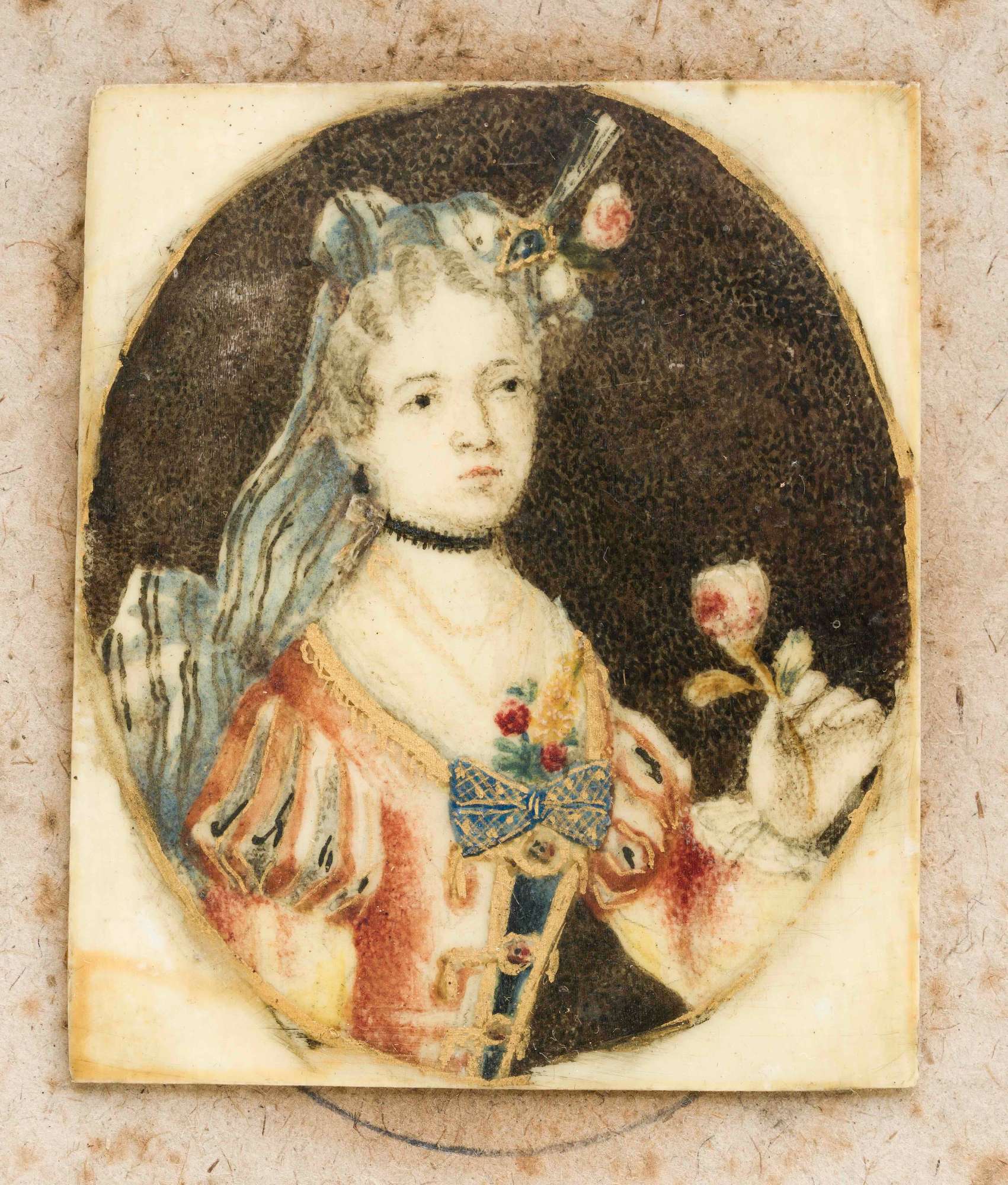Ovale raffigurante un ritratto di donna con rosa in mano.