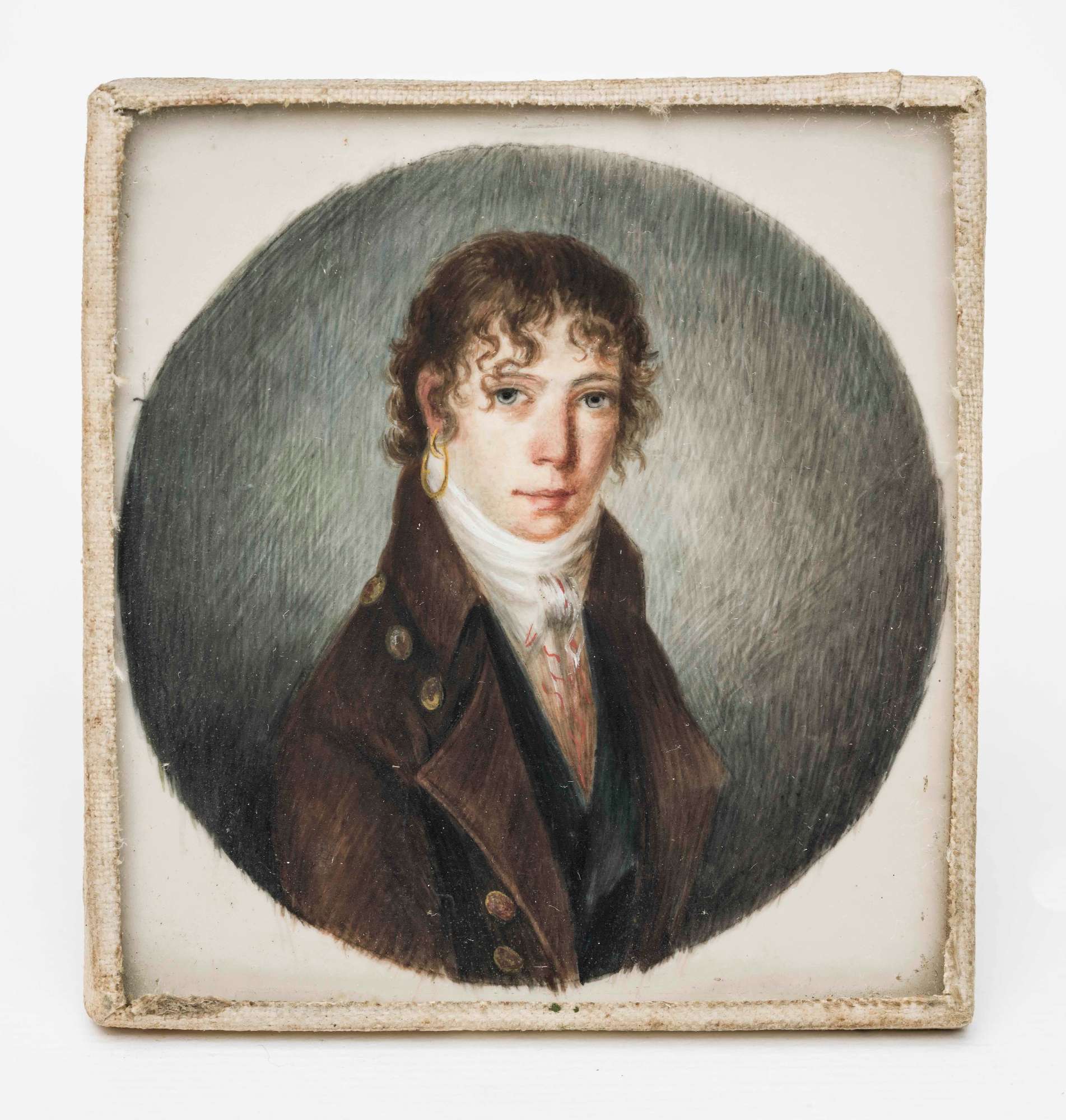 La miniatura, entrata nelle collezioni civiche nel 1976 attraverso il legato Rusconi-Opuich, ritrae un giovane uomo rivolto di tre quarti verso destra, con il volto girato verso l’osservatore, che indossa una marsina marrone, gilet operato, camicia bianca e cravatta in tinta. Il volto, reso in modo realistico, è incorniciato da capelli ricci à la Brutus, che lasciano scoperto l’orecchio destro da cui pende un orecchino.