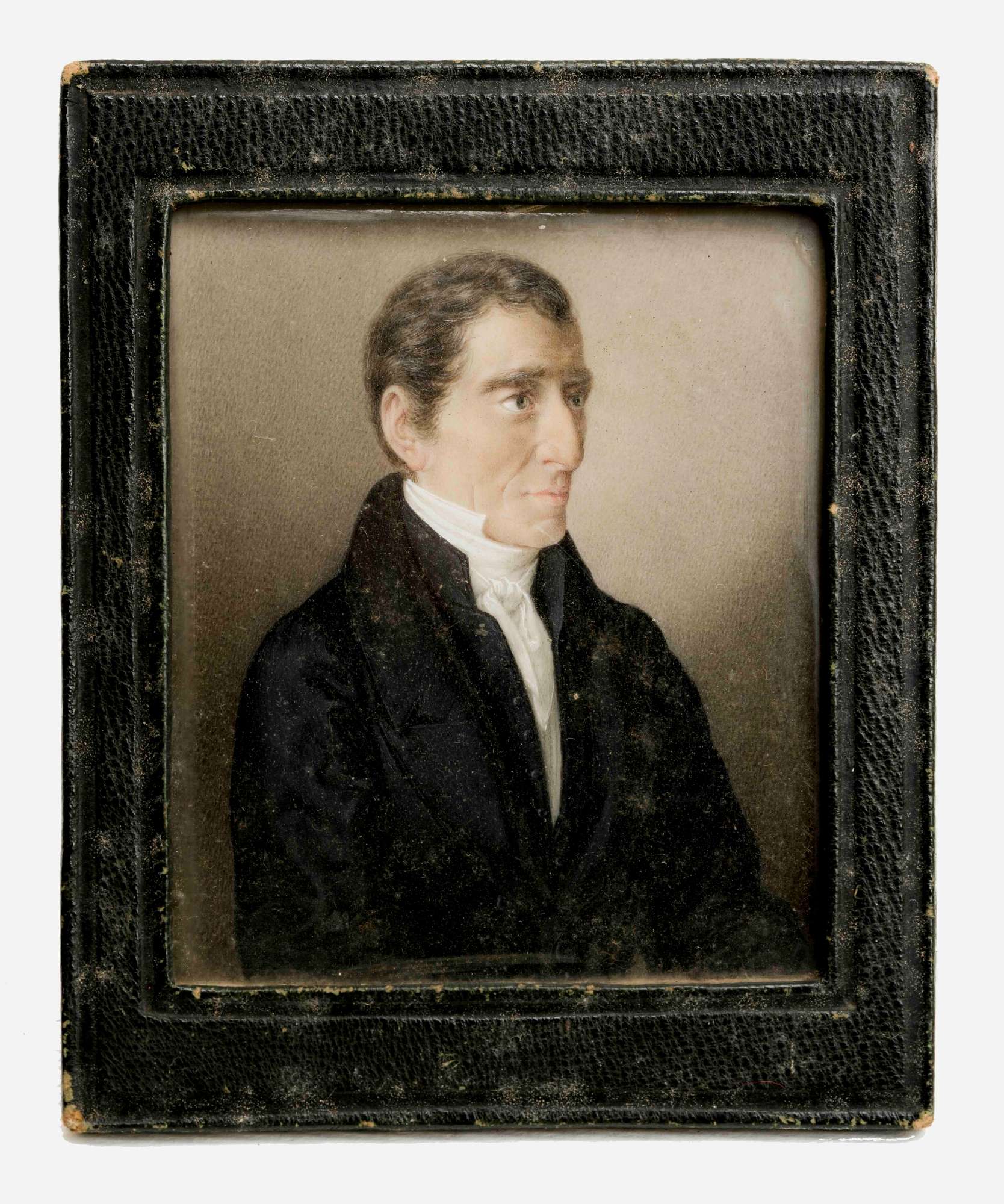 Ritratto maschile entro cornice di pelle; mezza figura, ruotato di tre quarti verso destra.