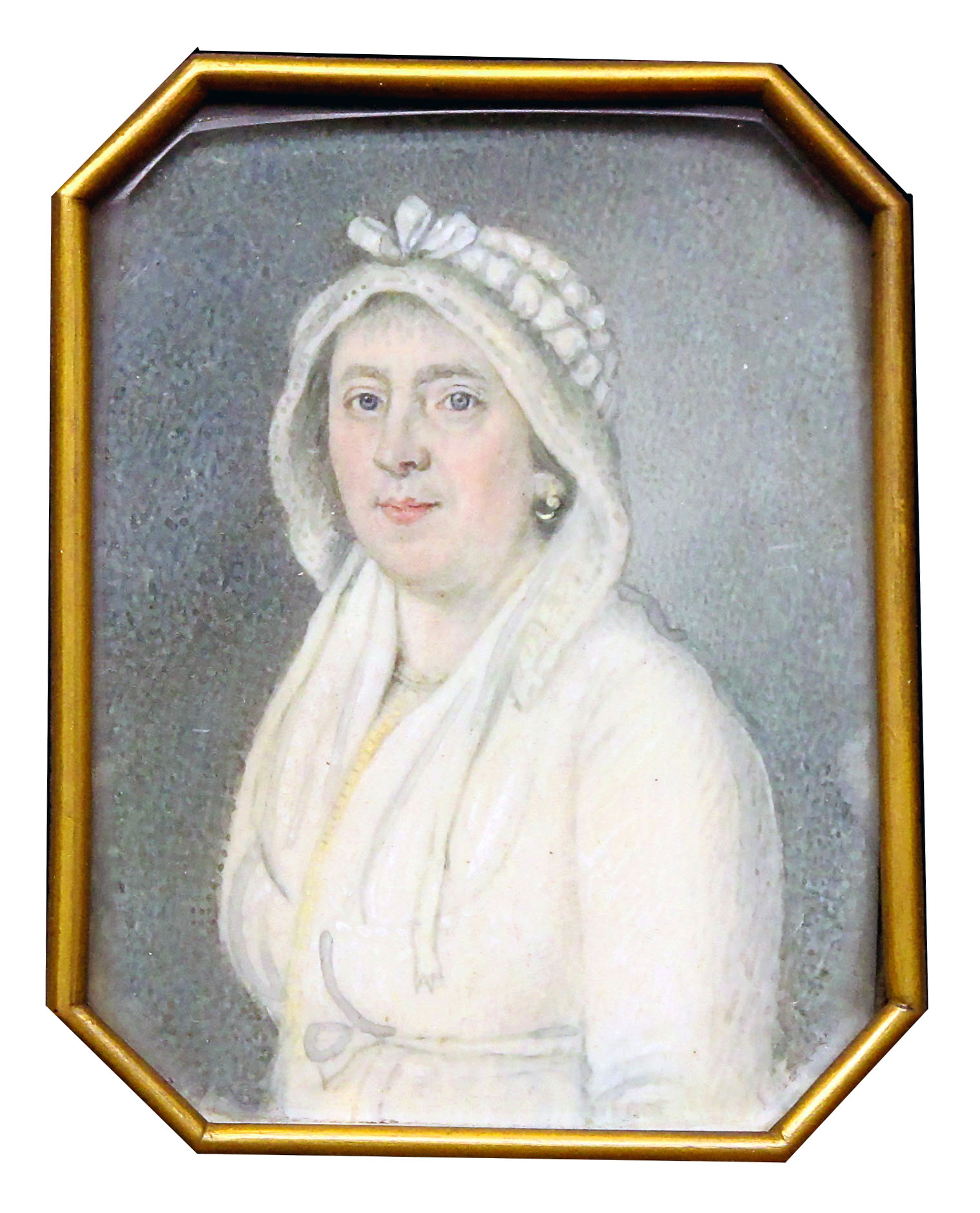 Il ritratto in miniatura, insieme a quelli agli invv. 21202, 21204-21206, collocati nella medesima cornice in velluto rosso, riproducono le effigi di una famiglia non ancora individuata. Probabilmente l’insieme giunse nelle collezioni civiche attraverso il legato di Anna Sartorio nel 1947, come potrebbe attestare un’immagine storica (Ritratti a Trieste 1993, p. 11). Di certo l’effigie in esame è da riconoscere nella capostipite della famiglia, che qui indossa un abito bianco e una cuffia.