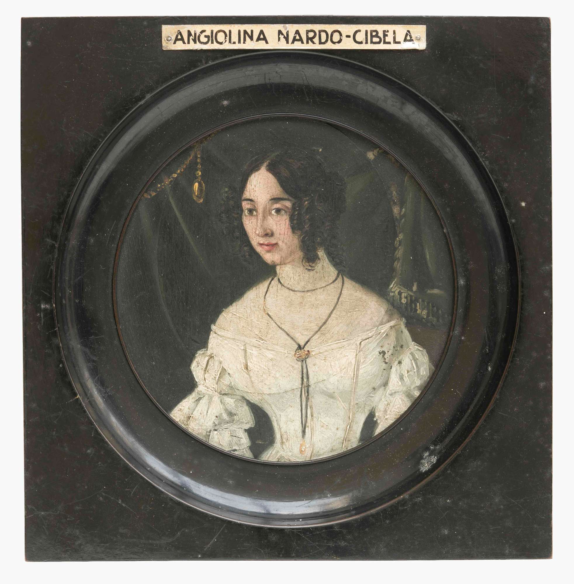 Il ritratto in miniatura, pervenuto nelle collezioni civiche nel 1923, dovrebbe rappresentare, stando all’iscrizione sulla cornice, la studiosa delle tradizioni locali Angelina Nardo-Cibele (Venezia, 1850-1938), che dedicò la sua vita a raccogliere testimonianze su usi, costumi e linguaggi popolari, soprattutto dell’area bellunese. L’identità dell’effigiata, allo stato attuale, è destinata a rimanere incerta: l’abbigliamento e l’acconciatura non sembrano compatibili con una datazione attorno agli anni settanta del XIX secolo.
