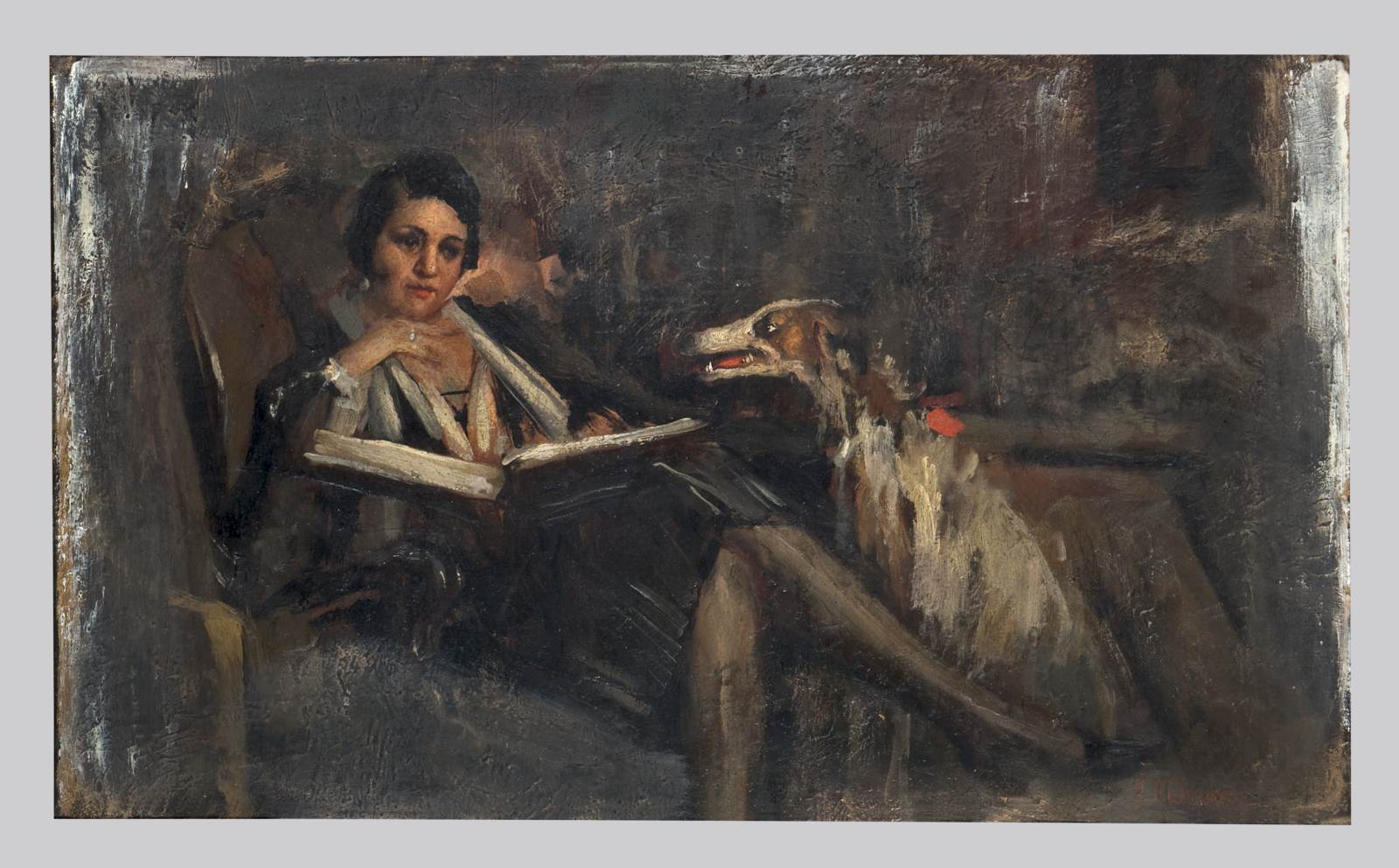 La soprano Ida Quaiatti (Spalato 1890-Venezia 1961) è qui ritratta in un interno a figura intera. Siede su una poltrona girata di tre quarti verso sinistra e con le gambe accavallate mentre legge un libro. Indossa una camicia bianca con un foulard al collo, giacca e gonna al ginocchio di colore scuro, scarpe décolleté con il tacco. Accanto a lei siede un levriero ripreso di profilo.