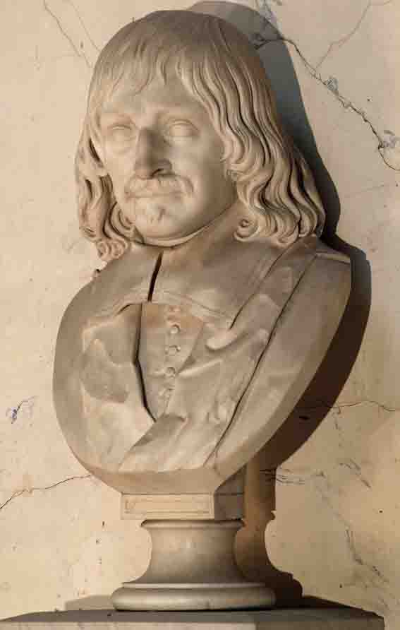 Il busto di René Descartes è collocato lungo la parete che affianca l’ultimo tratto dello scalone che porta al secondo piano di Palazzo Revoltella. Alternati a bassorilievi bronzei di carattere simbolico, che sono disposti anche sulle pareti del vestibolo e che rappresentano Scienze ed Arti, troviamo infatti i busti di quattro filosofi vissuti fra Cinque e Settecento: René Descartes (La Haye 1596 - Stoccolma 1650, il cui nome latinizzato è Renatus Cartesius, in Italia modificato in Cartesio), Galileo Galilei (Pisa 1564 - Arcetri 1642), Gottfried Wilhelm von Leibniz (Lipsia 1646 - Hannover 1716) e Isaac Newton (Woolsthorpe 1643 - Kensington 1727). A questi si alternano le rappresentazioni di Poesia, Pittura, Architettura, Scultura, Musica (mentre le rappresentazioni di Storia, Fisica, Astronomia, Matematica, Chimica e Geografia sono distribuite nel vestibolo). Per quanto riguarda le fisionomie dei filosofi rappresentati, c’è da dire che sono confrontabili con altri ritratti e risultano rispondenti. In particolare si può osservare: il volto di Cartesio in un dipinto di Frans Hals del 1648, quello di Galilei in un’opera di Domenico Cresti o Crespi, detto il Passignano, datata ante 1642; Leibniz è riconoscibile sulla base del dipinto di Bernhard Christoph Francke (datato attorno al 1700), mentre i lineamenti di Newton trovano riscontro in un’opera di Godfrey Kneller del 1702. Queste opere fanno parte della decorazione voluta da Pasquale Revoltella per il suo palazzo di città. Più precisamente il programma iconografico, «soprattutto nei vani di passaggio e nelle sale di rappresentanza, è incentrato sul tema del progresso e del valore delle scienze e delle arti come fattori di sviluppo economico, tema che, in perfetta coerenza con la cultura positivista del suo tempo, rispecchia il pensiero di Revoltella e ne ispira costantemente l’azione, così nell’amministrazione delle sue imprese come nelle iniziative di carattere politico» (Masau Dan). Si inseriscono dunque perfettamente in questo progetto i quattro busti, realizzati da Luigi Ferrari probabilmente negli anni di costruzione del palazzo, tra il 1854 e il 1858 e che hanno di conseguenza come termine ante quem il 1858, quando il palazzo risulta pronto e completo di tutto l’apparato decorativo.