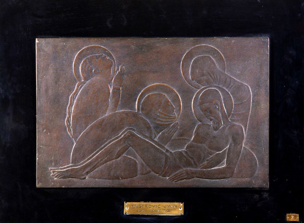 Nel 1939 Lilly e Ludmilla Kremenčič offrirono quattro bozzetti di Meštrović raffiguranti «Il pian - to delle pie donne (Deposizione di Gesù Cristo nel sepolcro) e Scena d’angeli» (in realtà Annunciazione) alla Gliptoteca di Zagabria, che non poté acquistarli per l’elevato prezzo. Per intervento del direttore della Gliptoteca, Antun Bauer (1911-2000), furono venduti ad una «famiglia amica» (CMR, Arch. Art., cartella Meštrović, Lilly e Ludmilla Kremenčič a N.N., Zaga - bria, 27 ottobre 1939). I bassorilievi, due in bronzo e due in gesso, erano stati in precedenza donati dallo stesso Meštrović allo scultore Svitoslav Peruzzi (1881-1936), che era stato suo compagno di studi all’Accademia di Vienna e successivamente suo collaboratore al Mausoleo della famiglia Račić. I due bozzetti in gesso raffiguranti il "Compianto su Cristo morto" e l’"Annunciazione" si trovano ora in collezione privata a Dubrovnik e sono datati al 1921, il bronzo con l’"Annunciazione" è di ubicazione ignota, mentre il bronzo con il "Compianto su Cristo morto" (non "La Pietà", come riportato nella targhetta) fu acquisito nel 1941 dal Museo Revoltella, mediante permuta, da Mario Coscia della Galleria d’Arte Trieste, su istanza dello scultore Marcello Mascherini (CMR, Verb. Cur., 25 gennaio 1941). Mario Coscia, a sua volta, lo aveva acquistato dal mercante d’arte Igino Calligaris (1907-1962) (CMR, Arch. Art., cartella Meštrović, Igino Calligaris a Mario Coscia, Zagabria, 3 febbraio 1941) con l’autentica di Antun Bauer redatta sulla riproduzione fotografica dell’opera (CMR, Arch. Art., cartella Meštrović, Zagabria, 1 febbraio 1941). I bassorilievi sono riferibili al Mausoleo della famiglia Račić di Cavtat, costruito da Meštrović nei pressi di Spalato tra il 1920 e il 1922 in stile art déco. Si tratta di studi per i rilievi che de - corano la campana appesa alla lanterna del mausoleo. Appartengono alla produzione religiosa incentrata sulla vita di Cristo, con cui Meštrović si confrontò per lungo tempo, e si collocano agli antipodi della sua produzione “eroica”. Il nostro "Compianto", il cui tema è eseguito con accenti espressionisti anche sul basamento dell’altare del Mausoleo, si caratterizza al contrario per un’essenziale stilizzazione che cristallizza il dolore delle pie donne, raccolte attorno al corpo di Cristo in un serrato equilibrio compositivo.