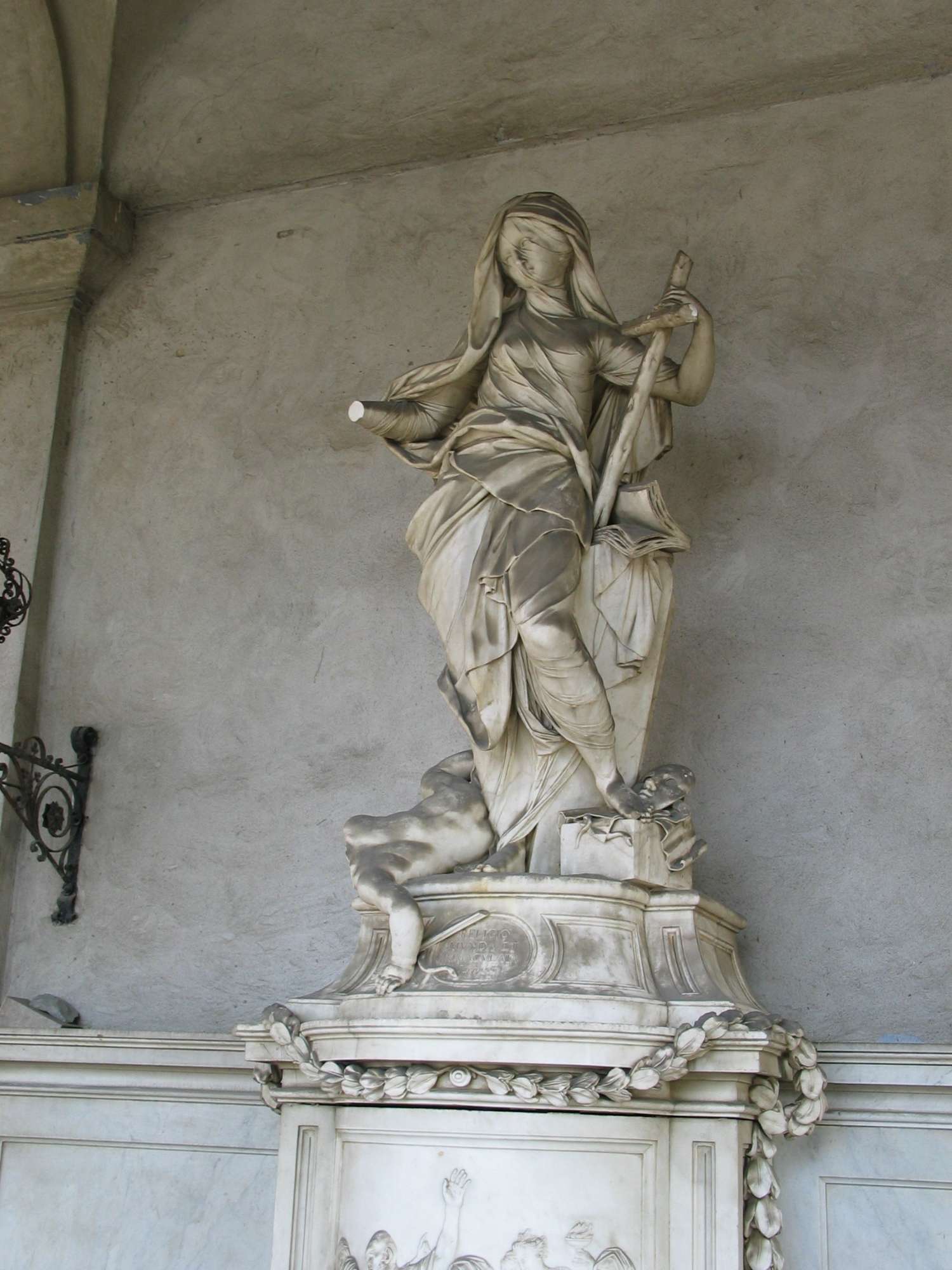 Su un alto piedestallo con al centro un bassorilievo rappresentante le Opere di Misericordia si erge una figura femminile velata, la Religione, che calpesta i simboli della menzogna e dell'ipocrisia e ha ai suoi piedi un puttino caduto, che dovrebbe rappresentare il peccato o il male; nella mano sinistra tiene stretta una croce, mentre nella destra pare tenesse un cuore fiammeggiante, oggi distrutto.