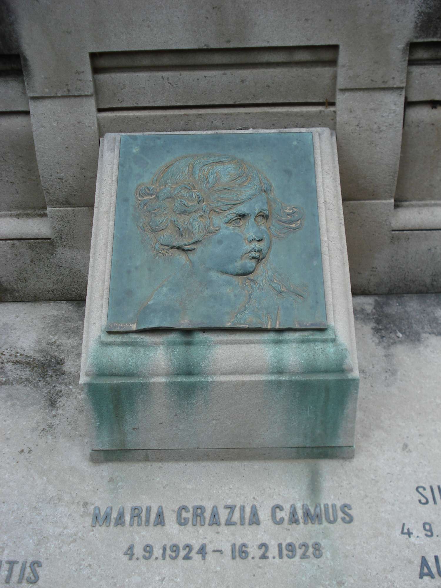 Il monumento consta di un blocco in pietra costituito da un corpo inferiore, con i profili superiori delle quattro facce modanati, e da uno superiore parallelepipedo, con croce a rilievo nella faccia anteriore. Davanti al blocco è posto, su una base dalla parte superiore spiovente, un rilievo bronzeo col delicato ritratto della piccola Maria Grazia Camus. Il tutto poggia su un alto zoccolo ai cui quattro angoli sono collocati altrettanti vasi portafiori in pietra, gli anteriori con piante, i posteriori con vano chiuso da un blocchetto di pietra, non fissato.