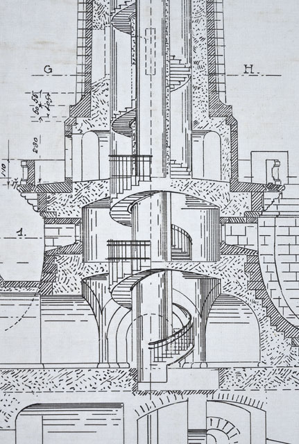 Entro linea di margine, disegno quotato raffigurante la sezione in alzato del Faro della Vittoria fino al secondo ballatoio con planimetrie relative a diverse altezze dello spaccato, indicate con lettere dell'alfabeto; alzato dello zoccolo a campana con accesso al Faro. Scala 1/100.