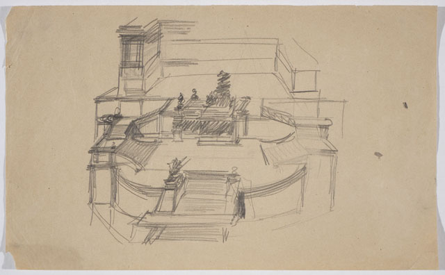 Sul recto, schizzo a matita raffigurante veduta prospettica del monumento in onore di Vittorio Emanuele II. Sul verso, altro studio del monumento, schizzo della planimetria delle prime due piattaforme e altri dettagli architettonici.