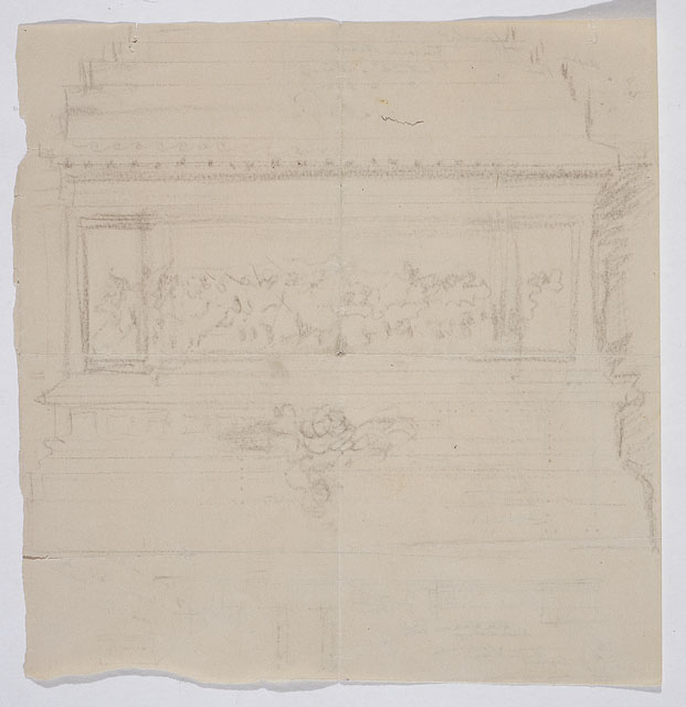 Il disegno fa parte di una serie di studi per il Monumento nazionale a Vittorio Emanuele II, cfr. schede CMSAOAR10_3646-CMSAOAR10_3688. Ruggero Berlam partecipò al secondo concorso per il monumento a Vittorio Emanuele II a Roma, indetto dal momento che la prima selezione, svoltasi nel 1880, non ebbe un vincitore. Nel primo bando l’unico vincolo posto ai progettisti era stato quello del costo; il secondo, pubblicato il 18 dicembre 1882, prevedeva di collocare il monumento sul colle Capitolino e ne fissava alcune caratteristiche: un fondale architettonico e una statua di Vittorio Emanuele II, dapprima seduto su un trono, poi a cavallo. Secondo Sticotti, Berlam inviò il progetto in incognito da Milano, per non essere riconosciuto come austriaco; ma dopo esser stato esposto a Roma, esso fu fatto sparire, su volontà del primo ministro Agostino Depretis, per non turbare i rapporti che si erano creati con l’Austria. Il concorso, cui parteciparono 98 progettisti, fu vinto da Giuseppe Sacconi, con un progetto che presenta affinità con quello di Ruggero Berlam; secondo classificato Manfredo Manfredi, terzo Bruno Schmitz. In seguito, vi fu un terzo bando ristretto ai primi tre classificati, vinto da Sacconi. Il progetto di Berlam, incentrato su purezza e classicità di linee (Marsoni 1986, p. 112), presenta una parte basamentale forte e compatta, alta la metà del monumento, che non avrebbe consentito di vedere il colonnato dalla Piazza Venezia, ma solo da via del Corso: un errore progettuale fatale, che, secondo Pozzetto, ne sancì l’eliminazione (1999, pp. 90-91). Il disegno in esame presenta uno schizzo del sotto-basamento del monumento equestre, sul recto; mentre il verso è dedicato all'organizzazione dei gruppi scultorei di uomini illustri posti all'ombra del monumentale colonnato (cfr. il prospetto definitivo in Pozzetto 1999, pp. 90-91, figg. 152-153).