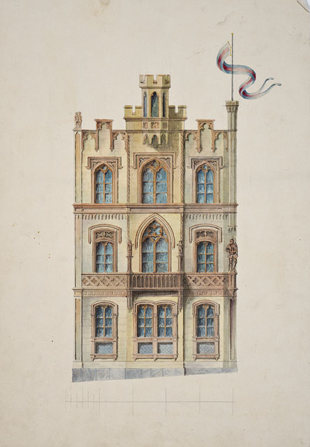Si tratta dello studio per la facciata laterale di una villa o castelletto di tipo gotico inglese, una delle declinazioni dell’Eclettismo, che segnò, dopo la fioritura dell’arte neoclassica, una nuova stagione architettonica a Trieste nella seconda metà dell’Ottocento. Secondo Pozzetto, che data il disegno al 1854, si tratta del progetto eseguito da Giovanni Antonio Berlam per la villa Mauroner (Pozzetto 1999, p. 72). Per lo studio della facciata principale, cfr. CMSAOAR10_4106.