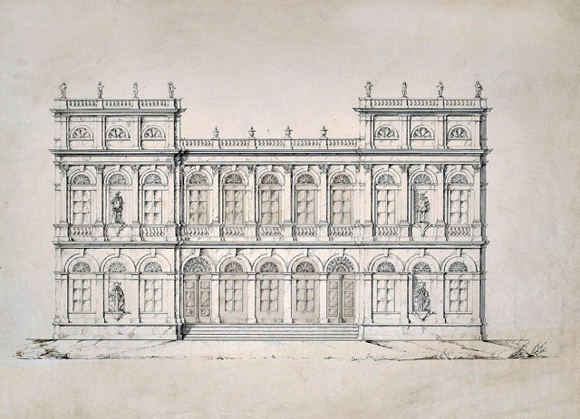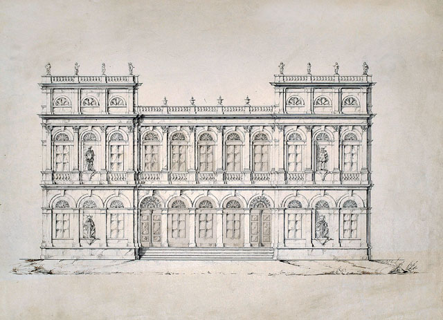 Lo studio in esame, attribuito a Giovanni Andrea Berlam per motivi di ordine compositivo e linguistico (Lettis 1993, pp. 46-47), è preparatorio alla facciata della villa Mauser, Cambiaggio, Psacaropulo, detta Villa Margherita, sita in via Commerciale 47 a Trieste. Nel 1852 l’ingegnere idraulico Giuseppe Mauser de Marquado acquistò il sito, ove in precedenza vi era una villa con serra, fatta edificare nel 1839 da Giovanni Buehler, che fece demolire. Affidò a Giovanni Andrea Berlam l'esecuzione di una nuova residenza, che venne completata nel 1857-8. Essa segue lo stesso schema compositivo e volumetrico del disegno, ma presenta un'ornamentazione minore. Il linguaggio rinascimentale espresso in questo progetto, secondo la critica, è strettamente legato agli studi condotti dall’architetto presso l'Accademia di Vienna negli anni 1841-42 (Ivi, p. 48).