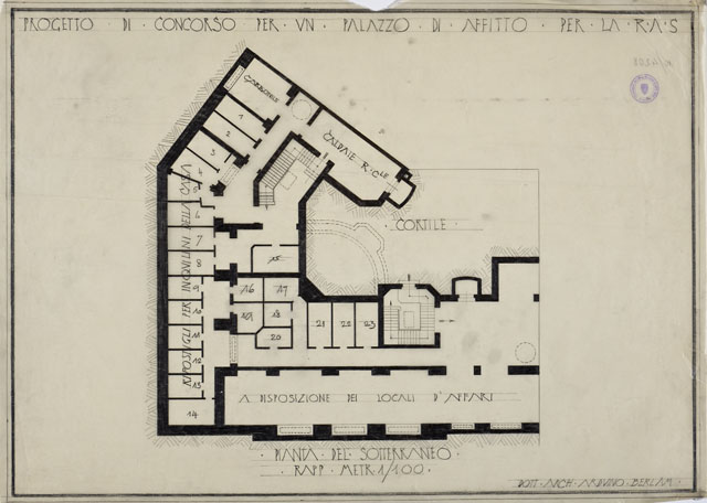 Disegno a matita e inchiostro su carta. Planimetria di un palazzo, pianta del sotterraneo. Scala 1:100.