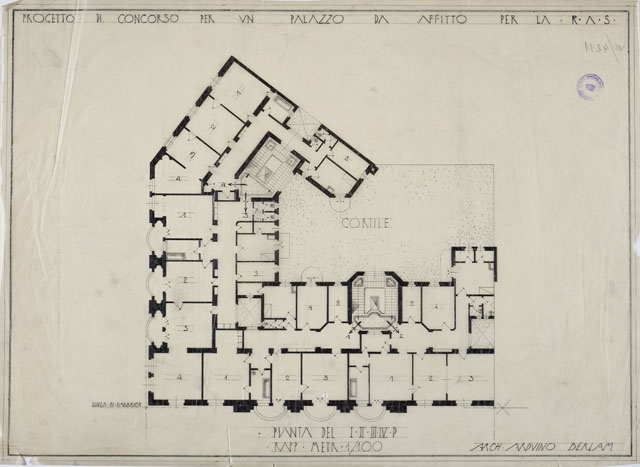 Disegno a matita e inchiostro su carta. Planimetria di un palazzo, pianta del I, II, III, IV piano. Scala 1:100. I vani sono numerati.