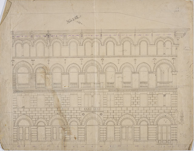 Il disegno è da riferirsi alla progettazione di Casa Leitenburg (cfr. CMSAOAR10_4227-CMSAOAR10_4232). Progettato nel 1887 da Ruggero Berlam per Edoardo de Leitenburg, l’edificio è considerato un capolavoro dell’architetto triestino, formatosi a Brera con Camillo Boito, oltre che un manifesto politico. Si tratta di un edificio di gusto neotuscanico, che divenne modello per innumerevoli edifici abitativi triestini, costruiti fino al 1940, quale esempio di autentica "architettura italiana". L’adozione, infatti, dello stile neo-fiorentino fu “apprezzata da alcuni eminenti triestini che ne valutarono la componente ideologica intesa quale rifiuto dello "stile austriaco" a favore di un’elaborazione autenticamente italiana” (Lorber 2007, p. 80). Si tratta di un'architettura equilibrata nel disegno in cui si accoppiano o isolano finestre architravate nel primo piano e a pieno centro nel secondo e terzo, ove sono rimarcate, di contro allo sfondo del cotto, da estradossi bicromi tendenti all'archiacuto. Nel disegno in esame, l’elaborazione del progetto non è ancora quella finale (cfr. CMSAOAR10_4227): lo spigolo del piano terra, come quelli del primo e terzo, sono pieni e si contrappongono all’apertura del quarto piano.