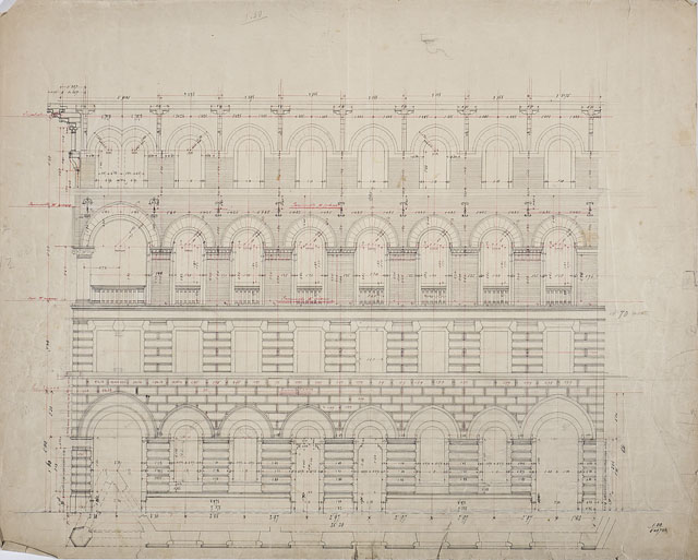 Il disegno è da riferirsi alla progettazione di Casa Leitenburg, cfr. CMSAOAR10_4226-CMSAOAR10_4232. Progettato nel 1887 da Ruggero Berlam per Edoardo de Leitenburg, l’edificio è considerato un capolavoro dell’architetto triestino, formatosi a Brera con Camillo Boito, oltre che un manifesto politico. Si tratta di un edificio di gusto neotuscanico, che divenne modello per innumerevoli edifici abitativi triestini, costruiti fino al 1940, quale esempio di autentica "architettura italiana". L’adozione, infatti, del neo-fiorentino fu “apprezzata da alcuni eminenti triestini che ne valutarono la componente ideologica intesa quale rifiuto dello "stile austriaco" a favore di un’elaborazione autenticamente italiana” (Lorber 2007, p. 80). Si tratta di un edificio equilibrato nel disegno in cui si accoppiano o isolano finestre architravate nel primo piano e a pieno centro nel secondo e terzo, ove sono rimarcate, di contro allo sfondo del cotto, da estradossi quasi archiacuti bicromi. Il disegno in esame illustra la facciata prospiciente la via Rossetti, in cui, eccetto per la soluzione d'angolo, le finestre non compaiono appaiate.