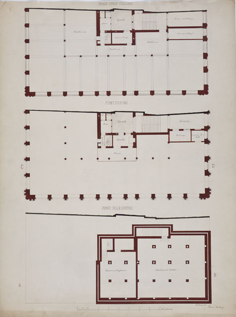 Progetto per una casa sulla via del Corso a Trieste. Il foglio presenta le piante della galleria, del piano terra e delle cantine di un palazzo adibito a café chantant; scala grafica in tese di Vienna.