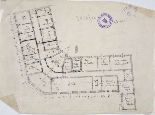 Disegno quotato a matita raffigurante il secondo piano di un edificio per l'Istituto Nazionale d'Assicurazione per gli Infortuni sul Lavoro. Studio delle distribuzioni dell'edificio con definizione della destinazione d'uso (scritte all'interno dei locali).