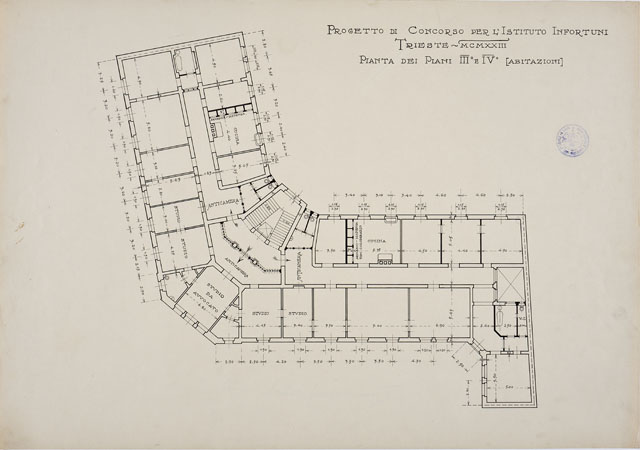 Tavola quotata a penna raffigurante la planimetria del III e IV piano di un edificio per l'Istituto Nazionale d'Assicurazione per gli Infortuni sul Lavoro. Scritte identificano la destinazione d'uso dei locali o le loro caratteristiche. Scala 1:100.