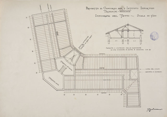 Si tratta di uno dei disegni della serie "Progetto per la costruzione della sede dell'Istituto Nazionale d'Assicurazione per gli Infortuni sul Lavoro in via Coroneo" eseguiti da Arduino Berlam, cfr. schede CMSAOAR10_4245 - CMSAOAR10_4271. Nel dicembre 1922 Arduino Berlam venne invitato a partecipare al concorso per la sede dell'Istituto Nazionale d'Assicurazione per gli Infortuni sul Lavoro, che sarebbe stata realizzata in via Coroneo a Trieste. Egli presentò la sua proposta il 14 marzo 1923, che non venne selezionata: fu preferito il progetto degli architetti Enrico e Umberto Nordio. La tavola illustra l'icnografia del tetto a falde disuguali, necessaria per avere i locali "prospicienti verso il cortile con soffitto piano" (cfr. Relazione allegata). Lo schizzo preparatorio è all'inventario CMSAOAR10_4251.