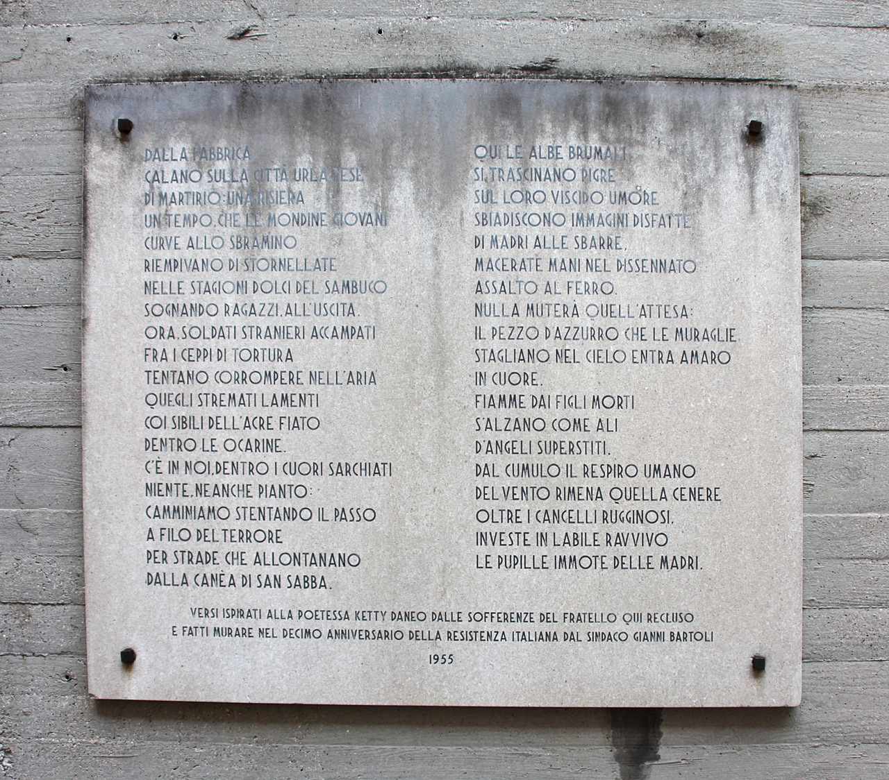 La poesia iscritta sulla lapide è intitolata "La Risiera di San Sabba"; l'autrice, Enrica Bon (Trieste 1908-1998), scrittrice e poetessa, era conosciuta con il nome d'arte di Ketty e con il cognome del marito, era infatti sposata con il pittore Renato Daneo (Trieste 1905-1978).