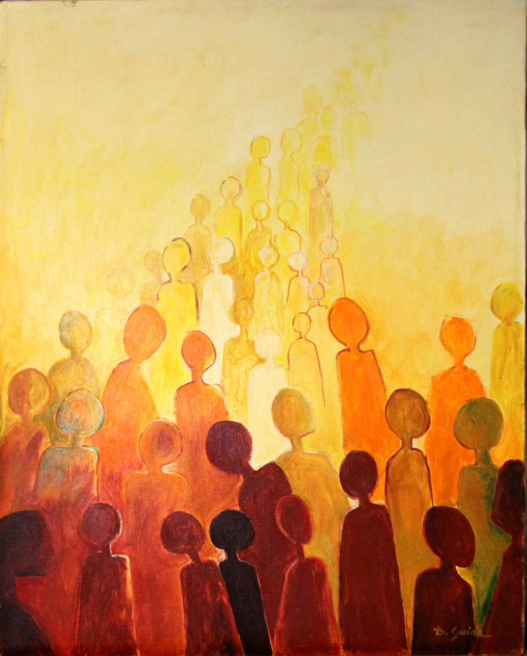 Il dipinto ha colori caldi, dal rosso scuro al giallo chiaro. Le figure umane, stilizzate, ridotte a testa, collo e corpo senza arti, sono realizzate con colori più scuri in primo piano, rosso e arancio, e man mano verso lo sfondo, diventano sempre più evanescenti, giallo e giallo chiaro, fino a sparire nella parte in alto a destra dell'opera.