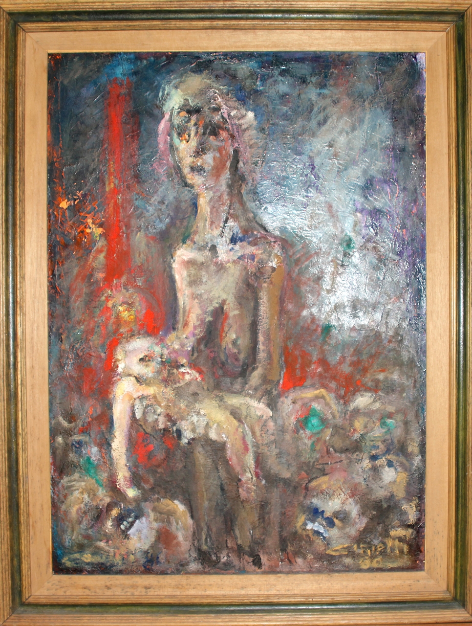 L'opera rappresenta una figura femminile seduta, con un bambino in grembo. Attorno, in basso, dettagli di morte.