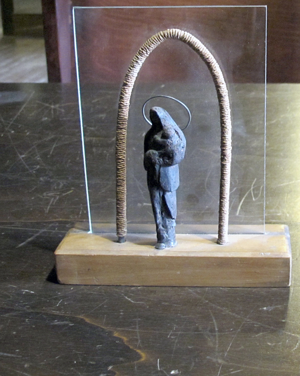 La sculturina rappresenta una Madonna stante con bambino, con aureola, entro un arco di ferro coperto con corda; poggia su un parallelepipedo di legno e le fa da sfondo un vetro inserito nel legno.