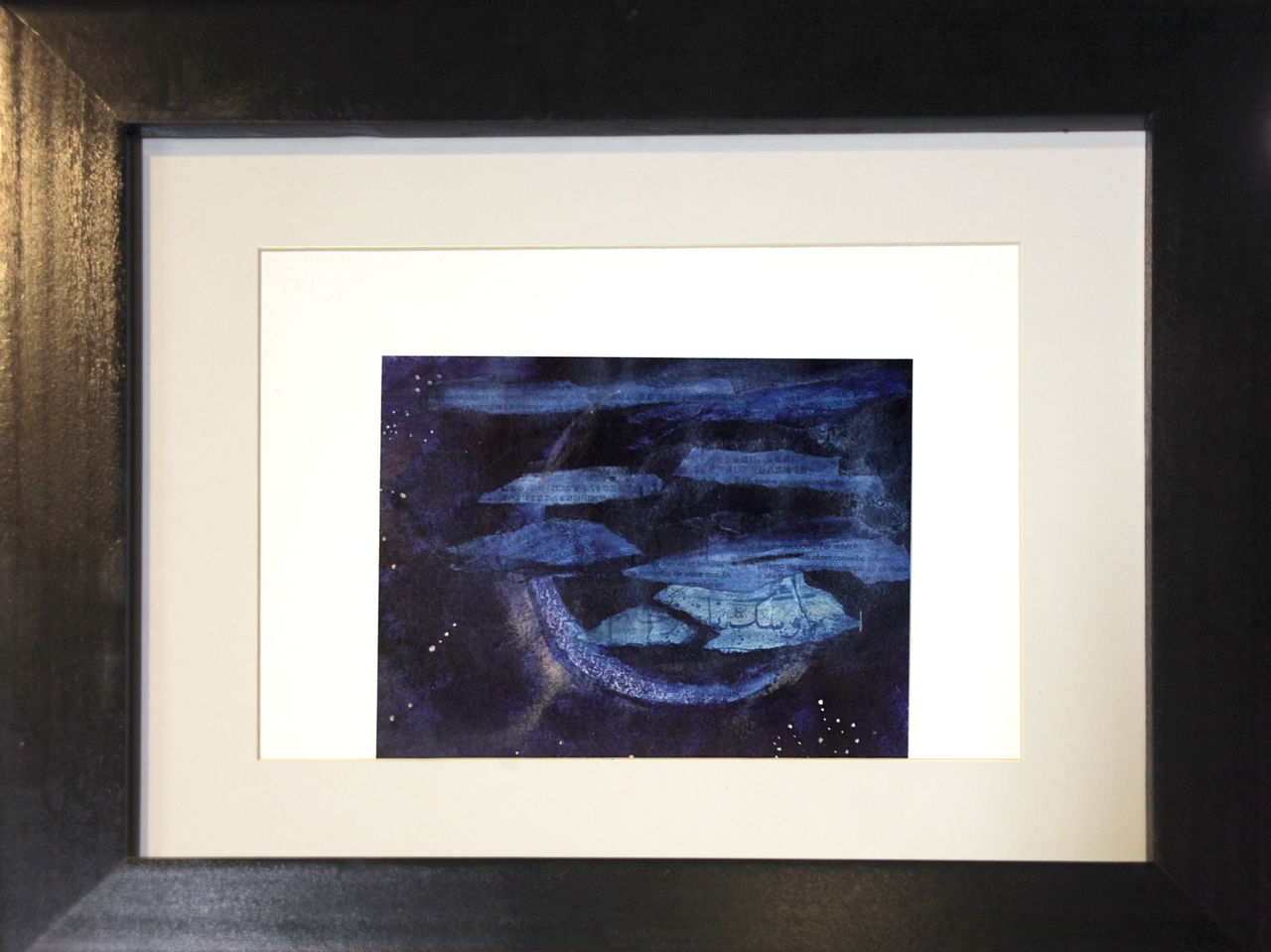 In un cielo blu scuro si aprono degli squarci in cui si vedono dei testi scritti in varie lingue. Dietro a essi, una mezzaluna sottile, attorno in basso e a sinistra, le stelle, piccoli punti luminosi.