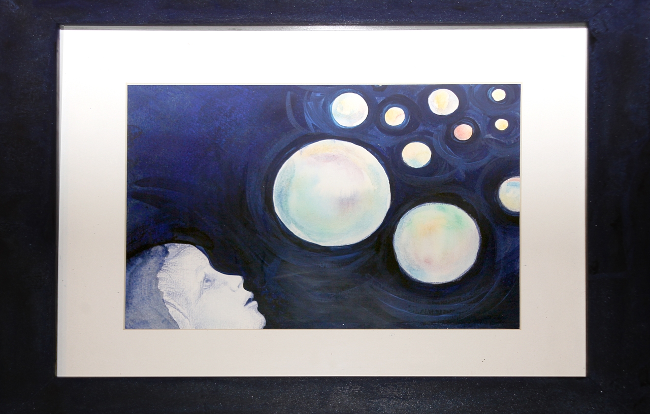 L'illustrazione rappresenta un volto femminile che, dal basso a sinistra, guarda in alto a destra, dove si stanno muovendo sfere grandi e piccole. Lo sfondo è blu scuro mentre la figura e le sfere di colori molto chiari.
