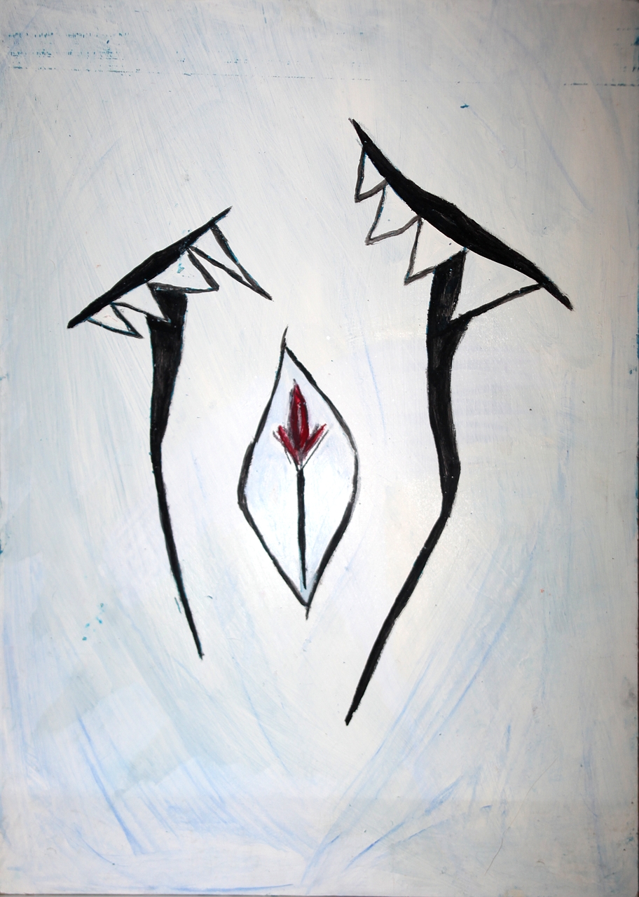 Il lavoro presenta delle fauci dipinte di nero con un tocco rosso, su fondo bianco.