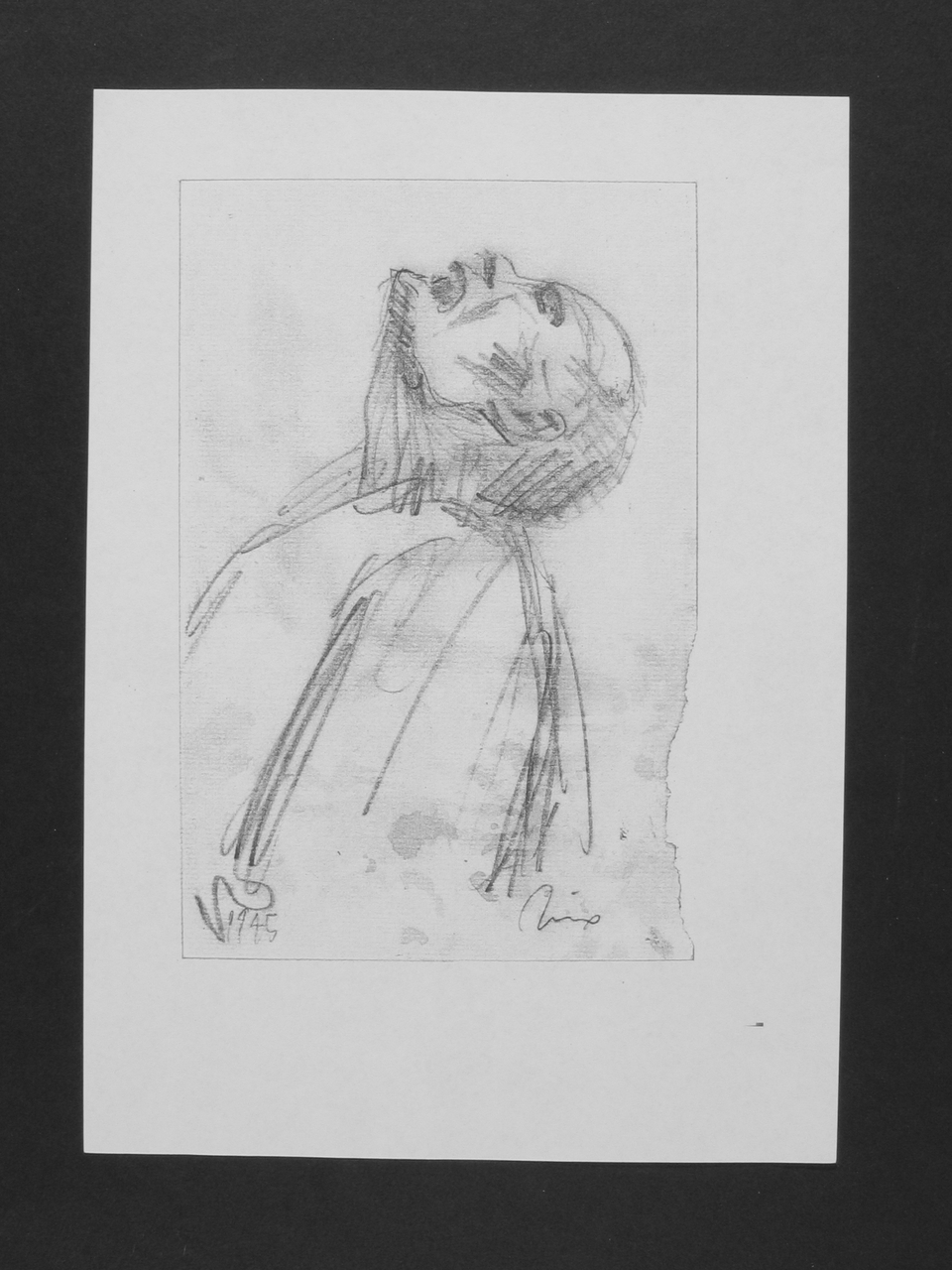 Persona raffigurata a mezzo busto, di profilo, con il capo rovesciato indietro, in stato di enorme sofferenza.