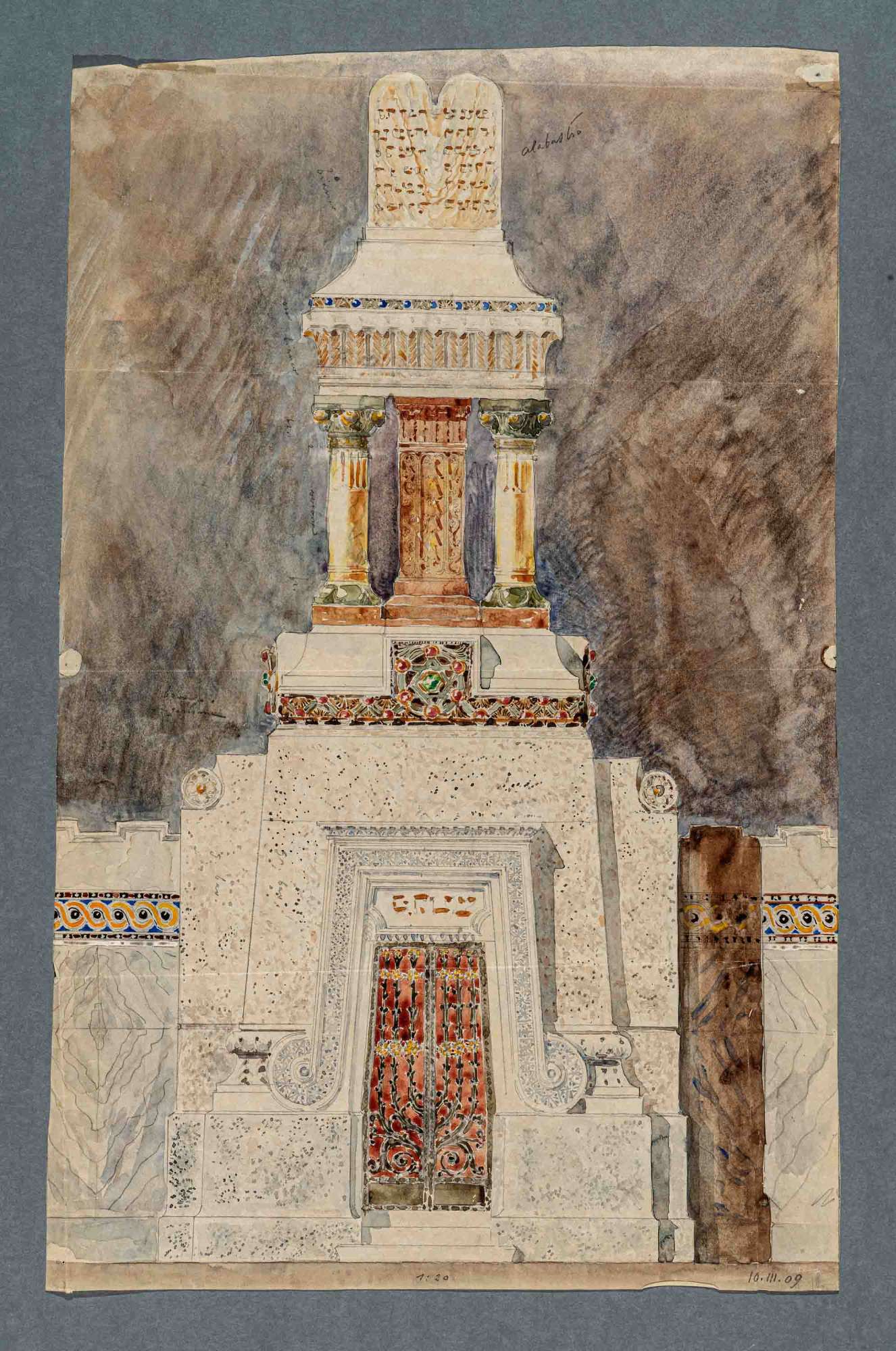 Il disegno in esame è il bozzetto preparatorio dell'Aron ha Qodesh, l'Armadio Sacro; riporta anche la scala 1:20 e alcune indicazioni su colori e materiali (ad esempio alabastro, bianco, oro).