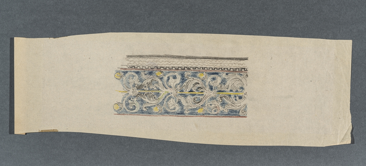 Il disegno è tracciato a matita colorata al centro di un ritaglio rettangolare di carta leggera. Raffigura un dettaglio progettuale per la decorazione delle volte della Sinagoga di Trieste.