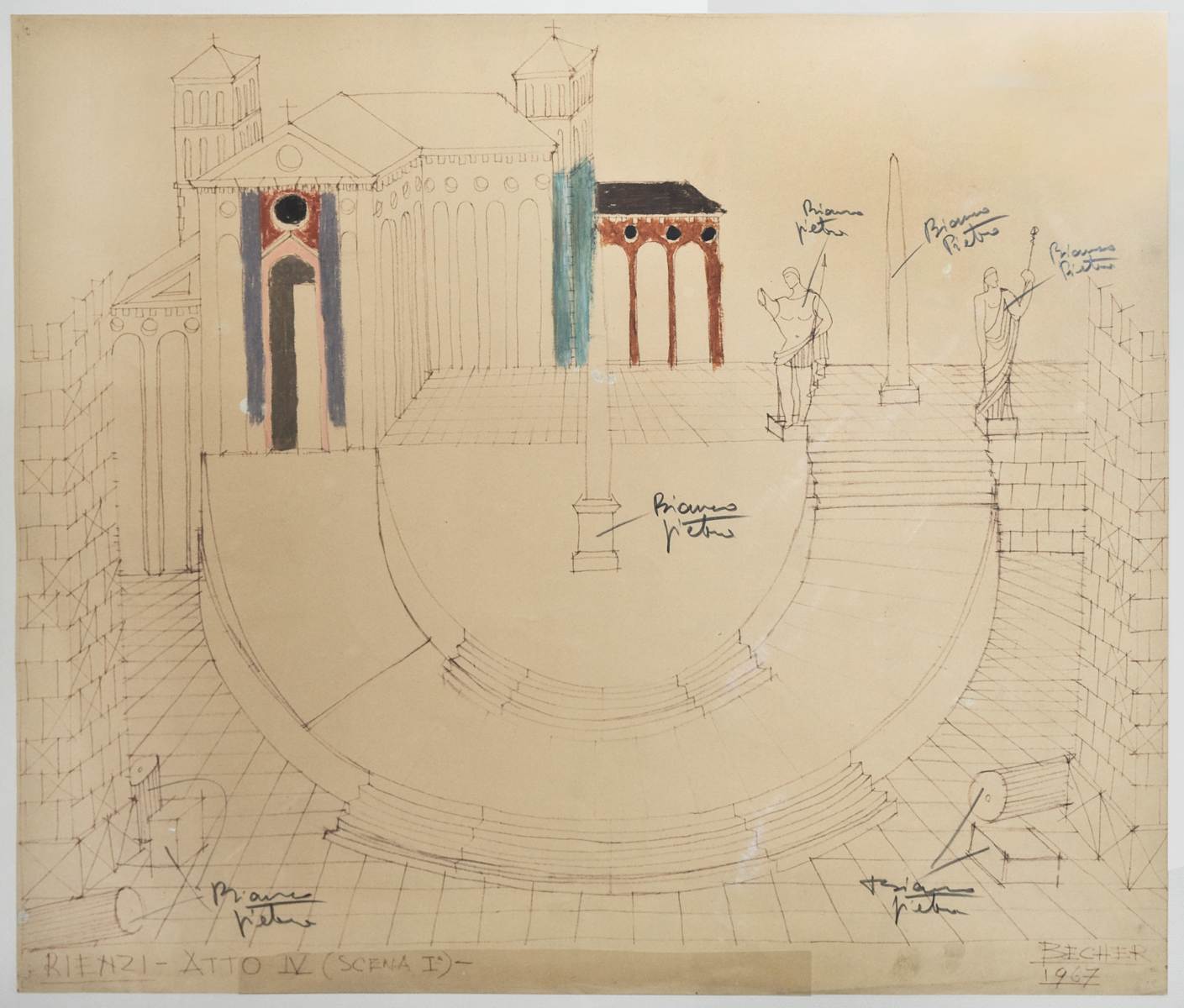 Scenografia per Rienzi, l'ultimo dei tribuni di Richard Wagner, Trieste, Teatro Verdi, stagione lirica 1967-1968, regia scene e costumi di Gianrico Becher