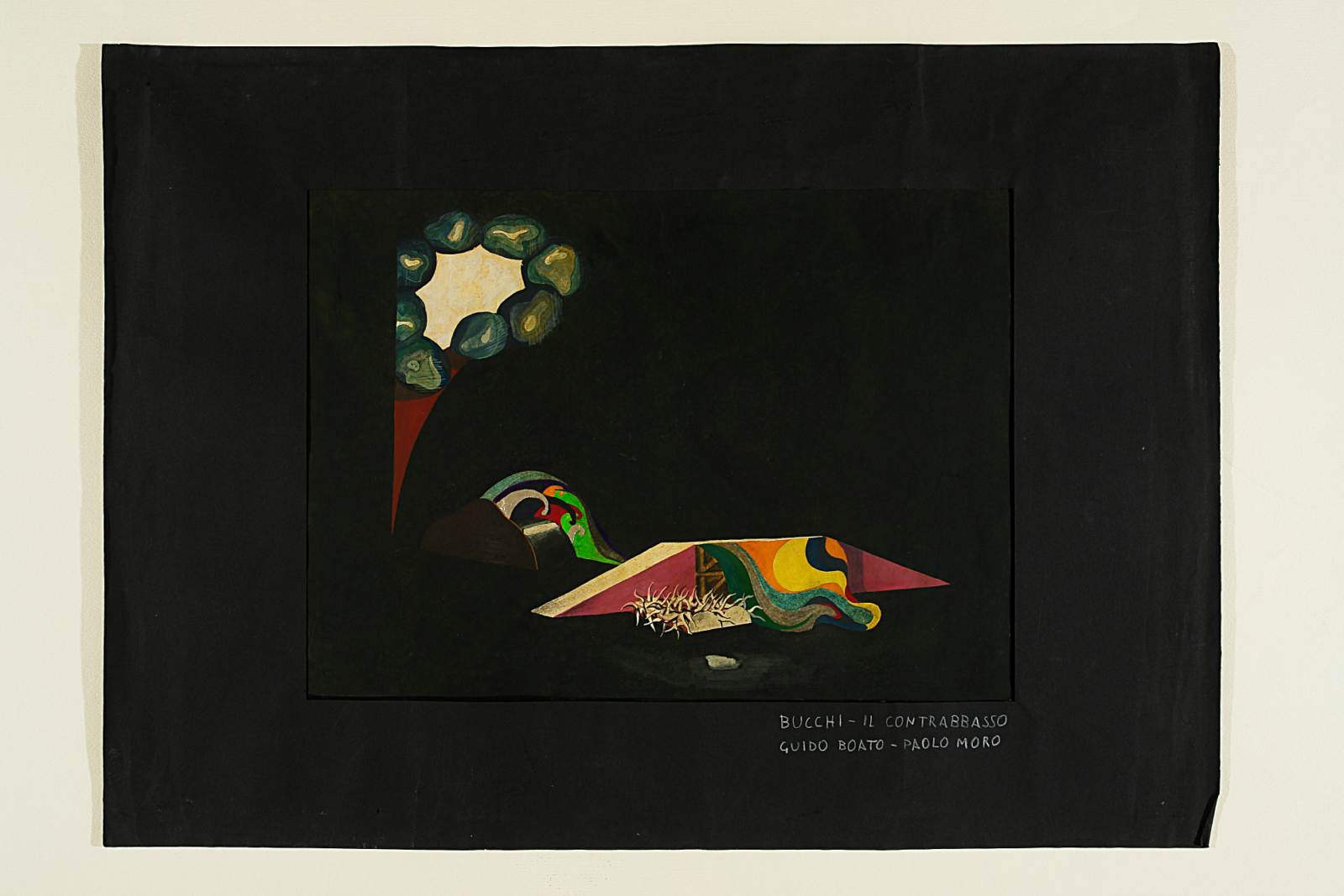 Il contrabbasso, grottesco in un atto di Valentino Bucchi. Soggetto astratto su sfondo nero, sulla sinistra elemento scenico, sul pavimento 4 elementi con volute e punte acuminate.