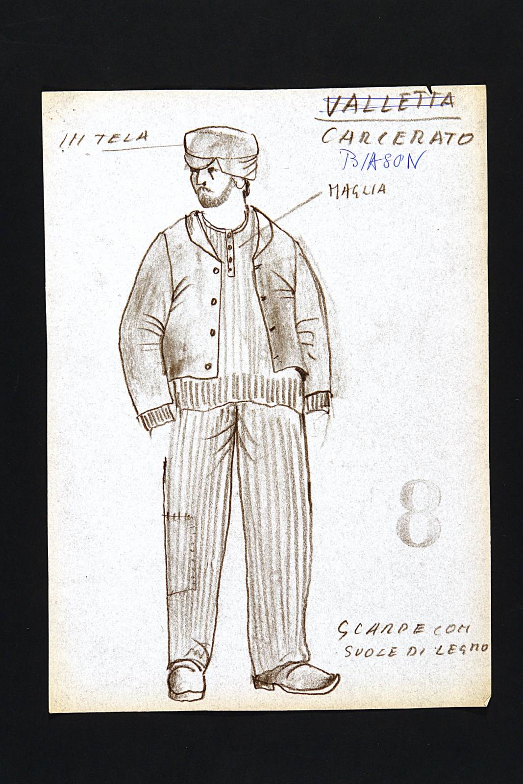 Motivo di scandalo e di riflessione, due tempi di John Osborne. Figura intera maschile di fronte in divisa da carcerato con giacca e cappello