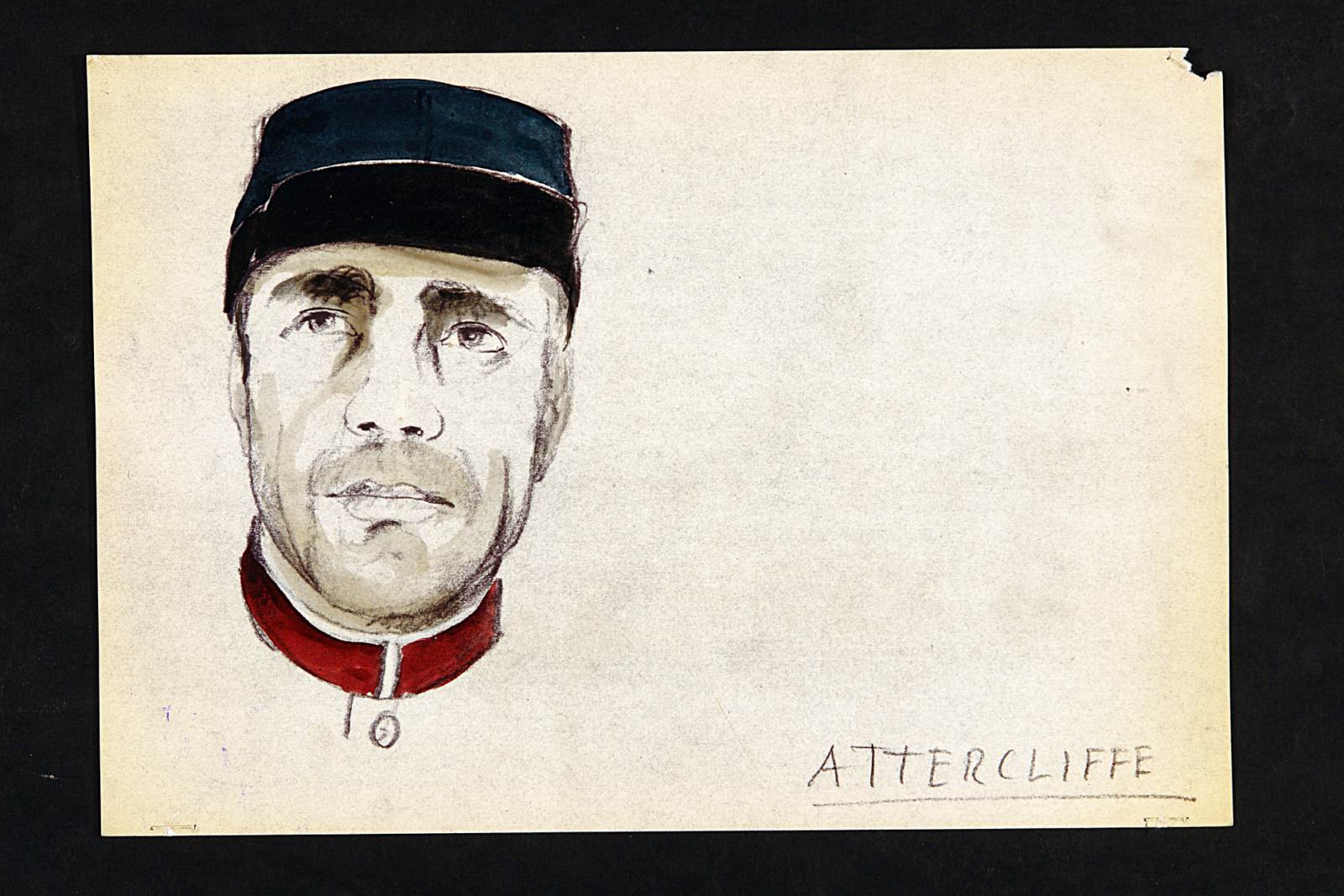 La danza del sergente Musgrave, testo teatrale di John Arden. Personaggio Attercliffe, volto maschile con colletto rosso di divisa militare e cappello militare con frontino.