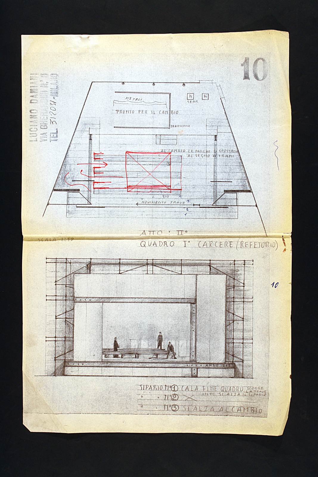 Motivo di scandalo e di riflessione, due tempi di John Osborne. Spazio del foglio diviso orizzontalmente in 2 parti: in alto pianta del palcoscenico, in basso bozzetto scenografico di interno di carcere con panche