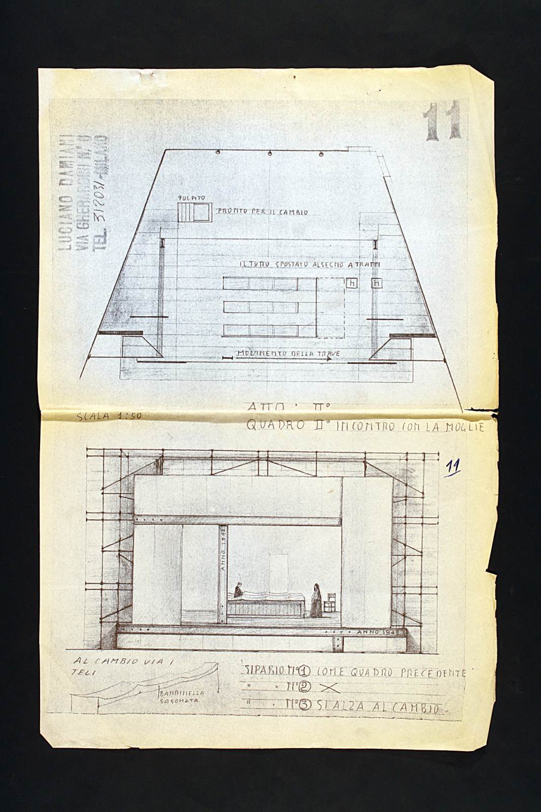 Motivo di scandalo e di riflessione, due tempi di John Osborne. Spazio del foglio diviso orizzontalmente in 2 parti: in alto pianta del palcoscenico, in basso bozzetto scenografico di interno di parlatorio in carcere, incontro tra carcerato e la moglie