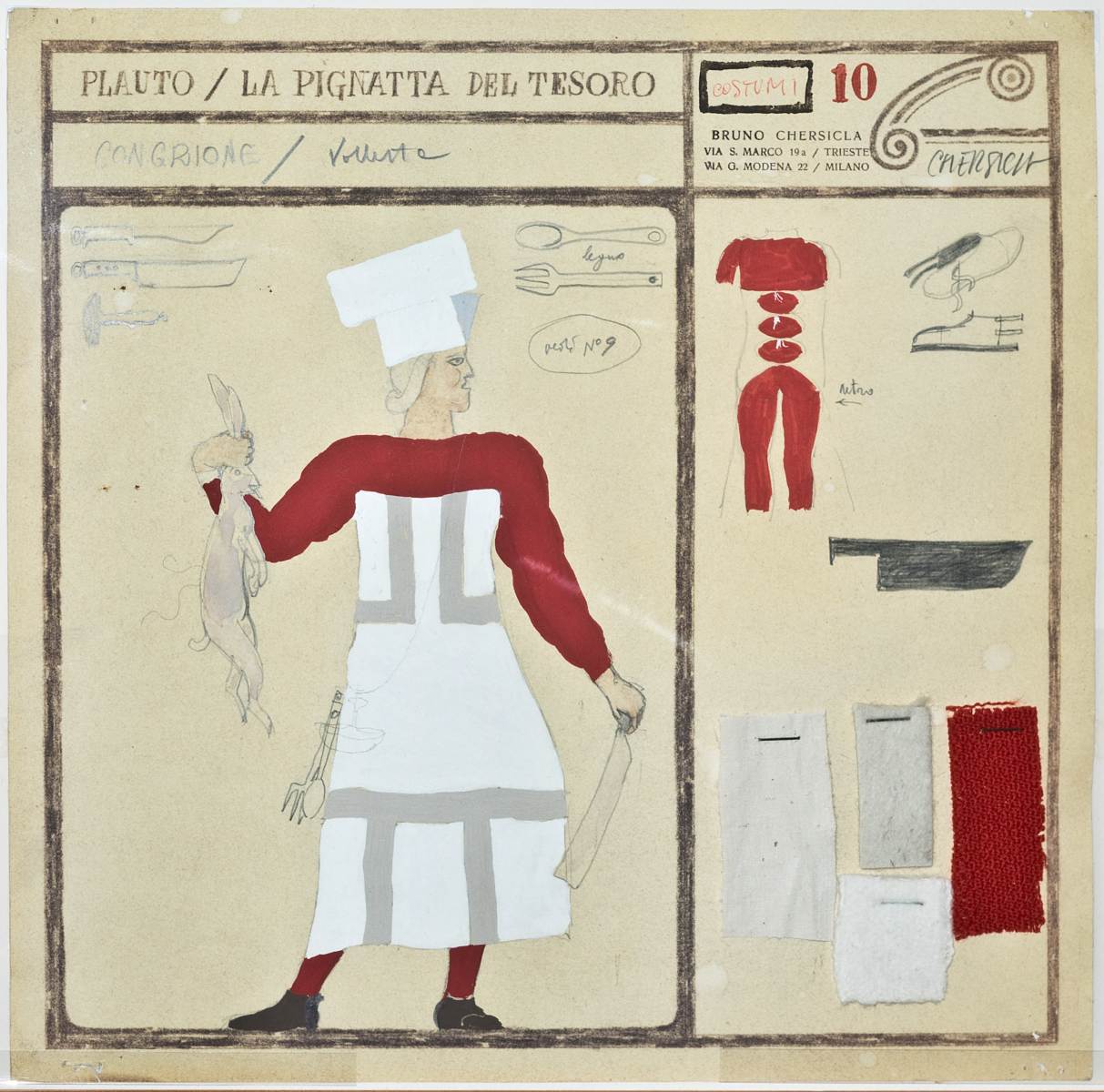 Figurino per Aulularia (La pignatta), testo teatrale di Tito Maccio Plauto (elaborazione di Lino Carpinteri e Mariano Faraguna), regia Ugo Amodeo, Teatro Auditorium e Teatro Romano dal 1 al 28 giugno 1966