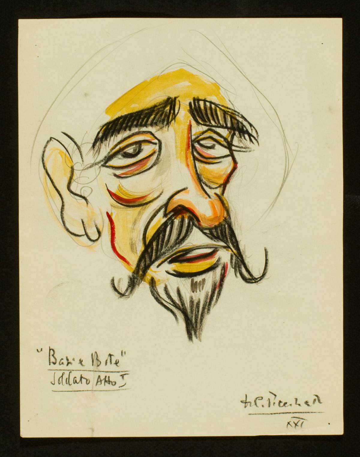 Basi e bote, opera di Riccardo Pick-Mangiagalli. Ritratto caricaturale di soldato con turbante, atto 1.