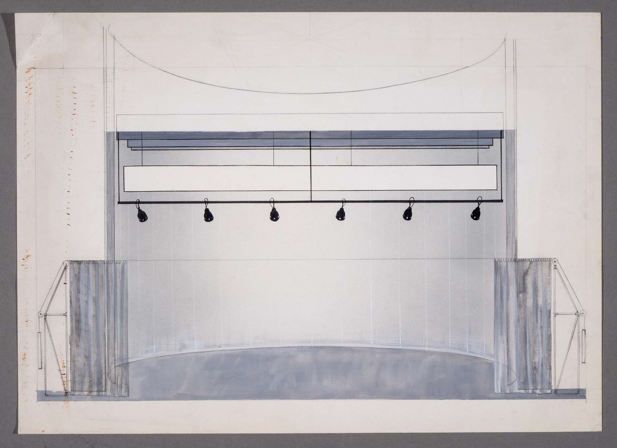 L'eccezione e la regola, dramma di Bertolt Brecht. Progetto per palcoscenico, scena essenziale e monocroma, fondale grigio. Dall'alto scende un cartello senza scritta e un'americana con sei faretti. ai lati siparietto con meccanismo a vista.