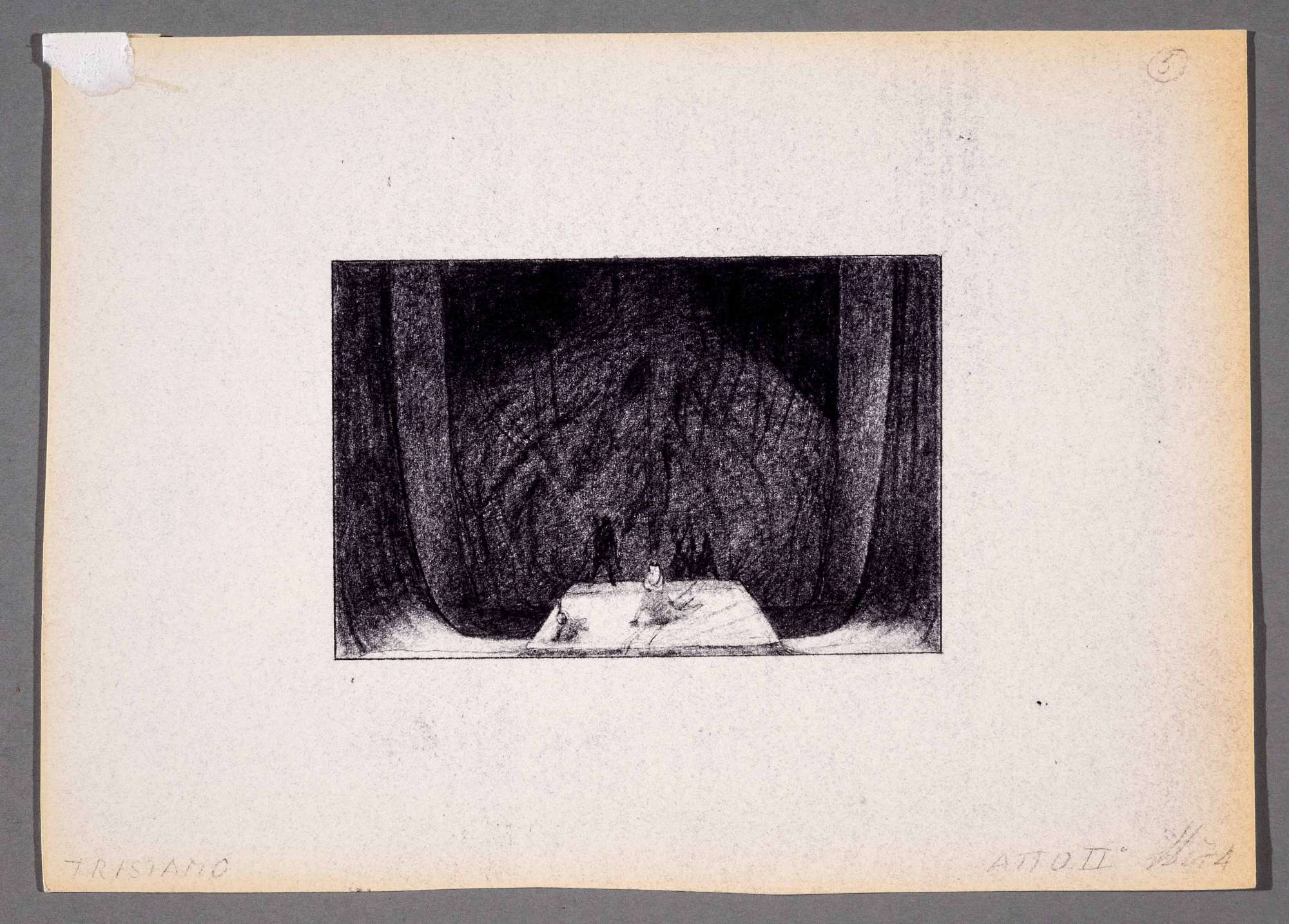 Tristano e Isotta, opera di Richard Wagner. Atto 2. Pedana trapezoidale al centro, si staglia su uno sfondo buio formato apparente da veli morbidi