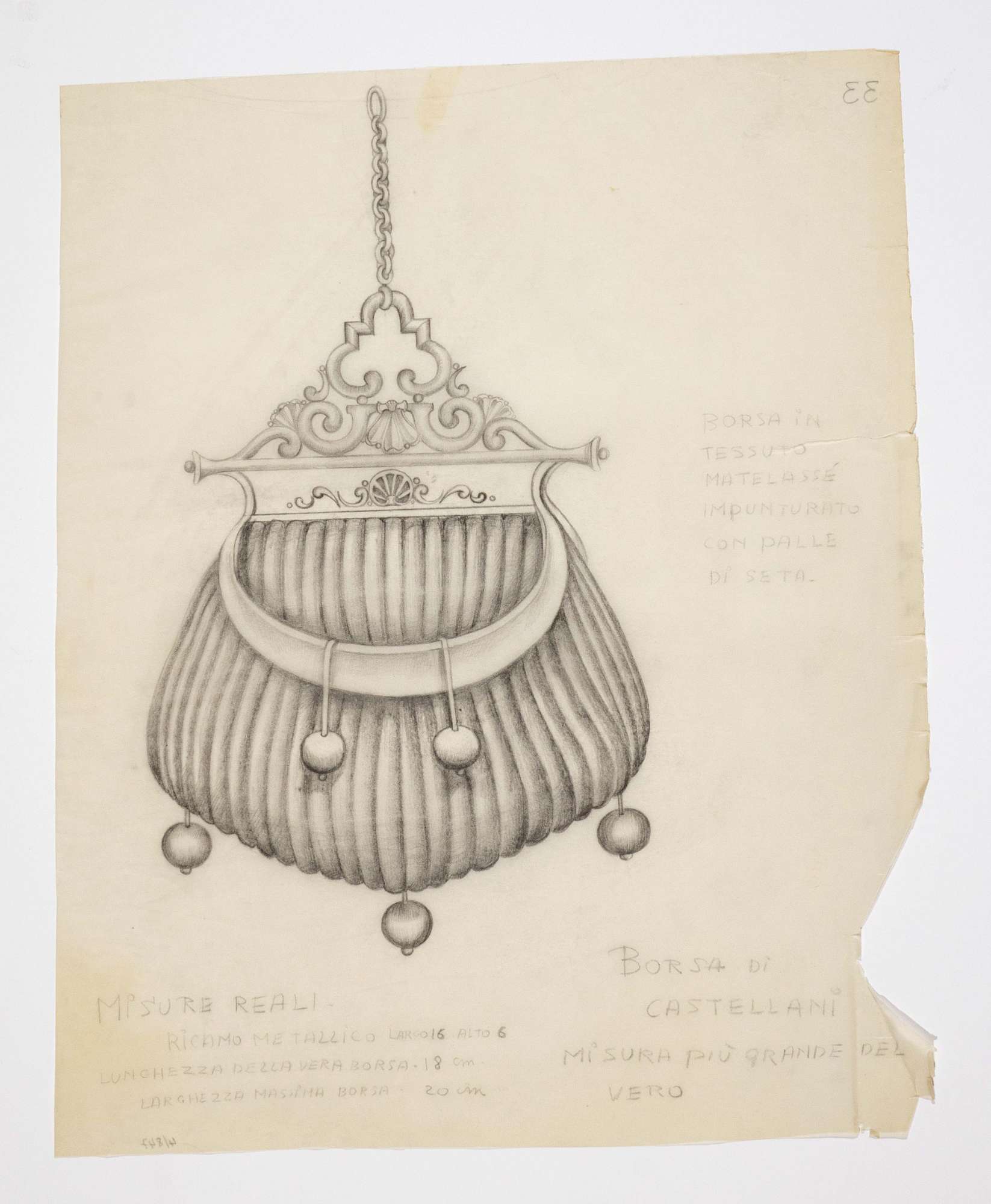 Il gioco dei potenti, libero adattamento di Giorgio Strehler da Enrico VI, dramma storico di William Shakespeare, in 15 atti e 2 giornate. Borsa in tessuto a coste con pendagli sferici ed elaborata placca metallica alla chiusura, tramite la quale è appesa una catenella ad una cintura appena accennata.