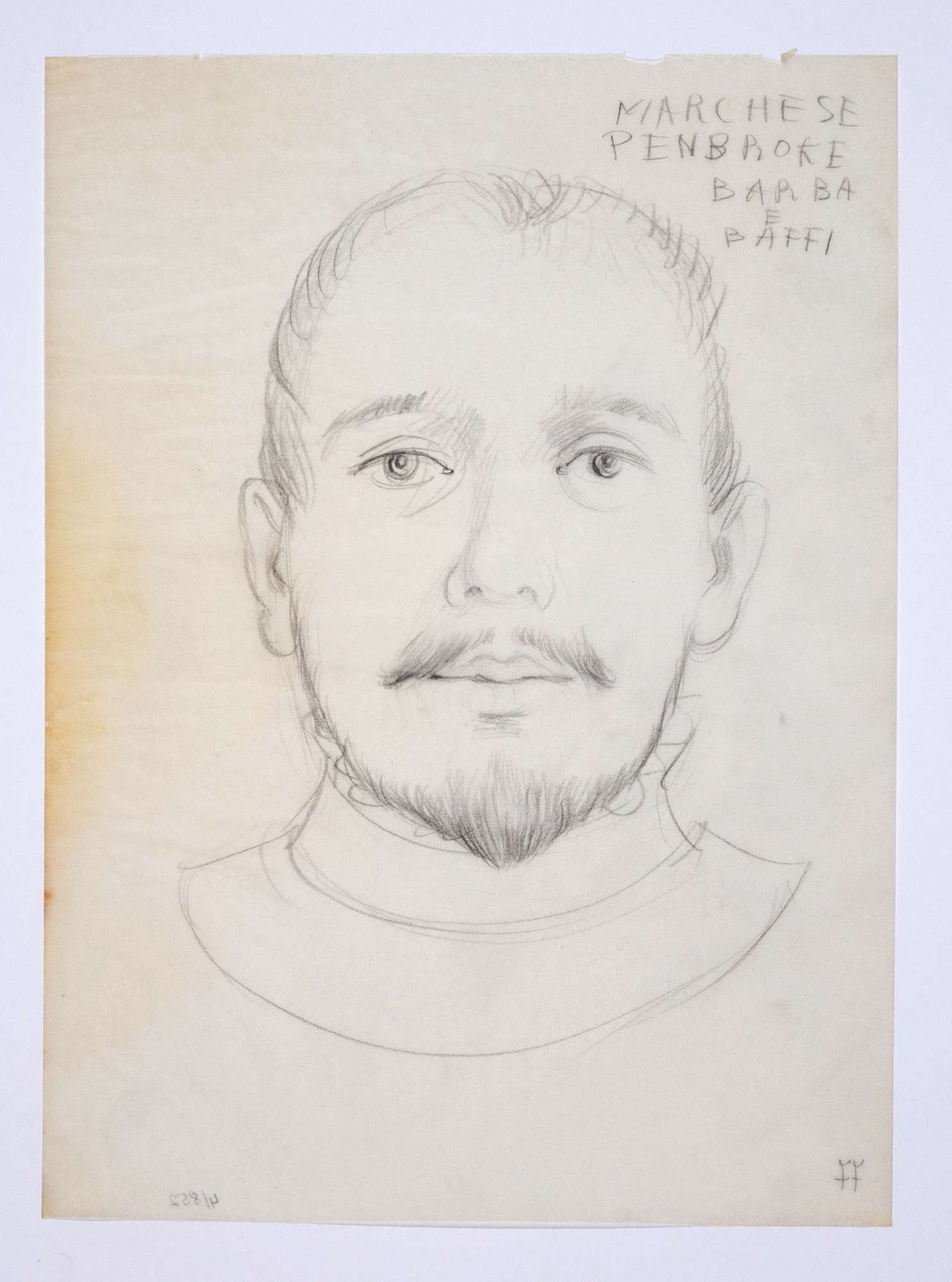 Il gioco dei potenti, libero adattamento di Giorgio Strehler da Enrico VI, dramma storico di William Shakespeare, in 15 atti e 2 giornate. Ritratto di testa maschile di fronte, a capo scoperto, barba e baffi.