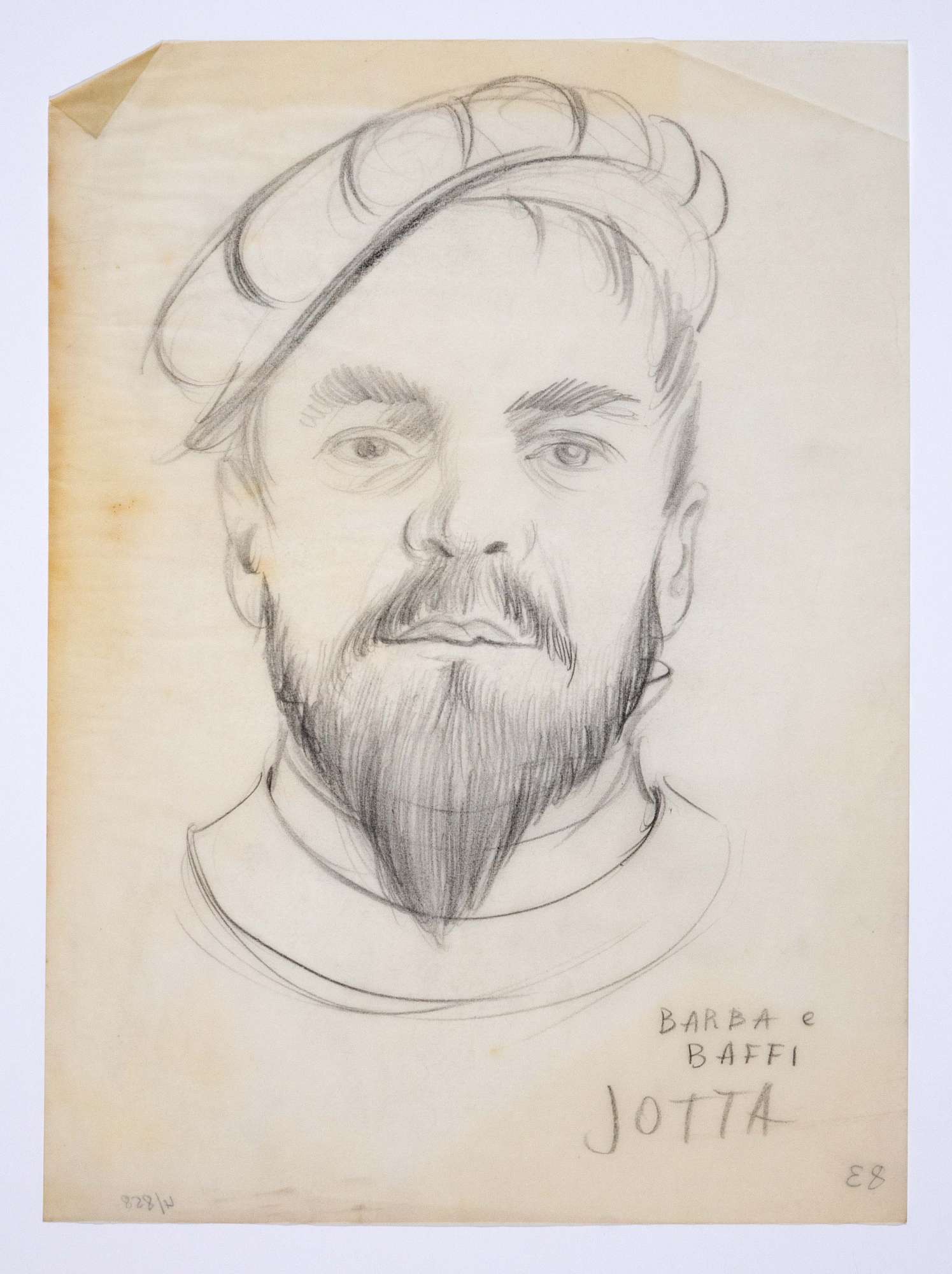 Il gioco dei potenti, libero adattamento di Giorgio Strehler da Enrico VI, dramma storico di William Shakespeare, in 15 atti e 2 giornate. Ritratto di testa maschile di fronte, con cappello rinascimentale, , barba a punta e baffi.